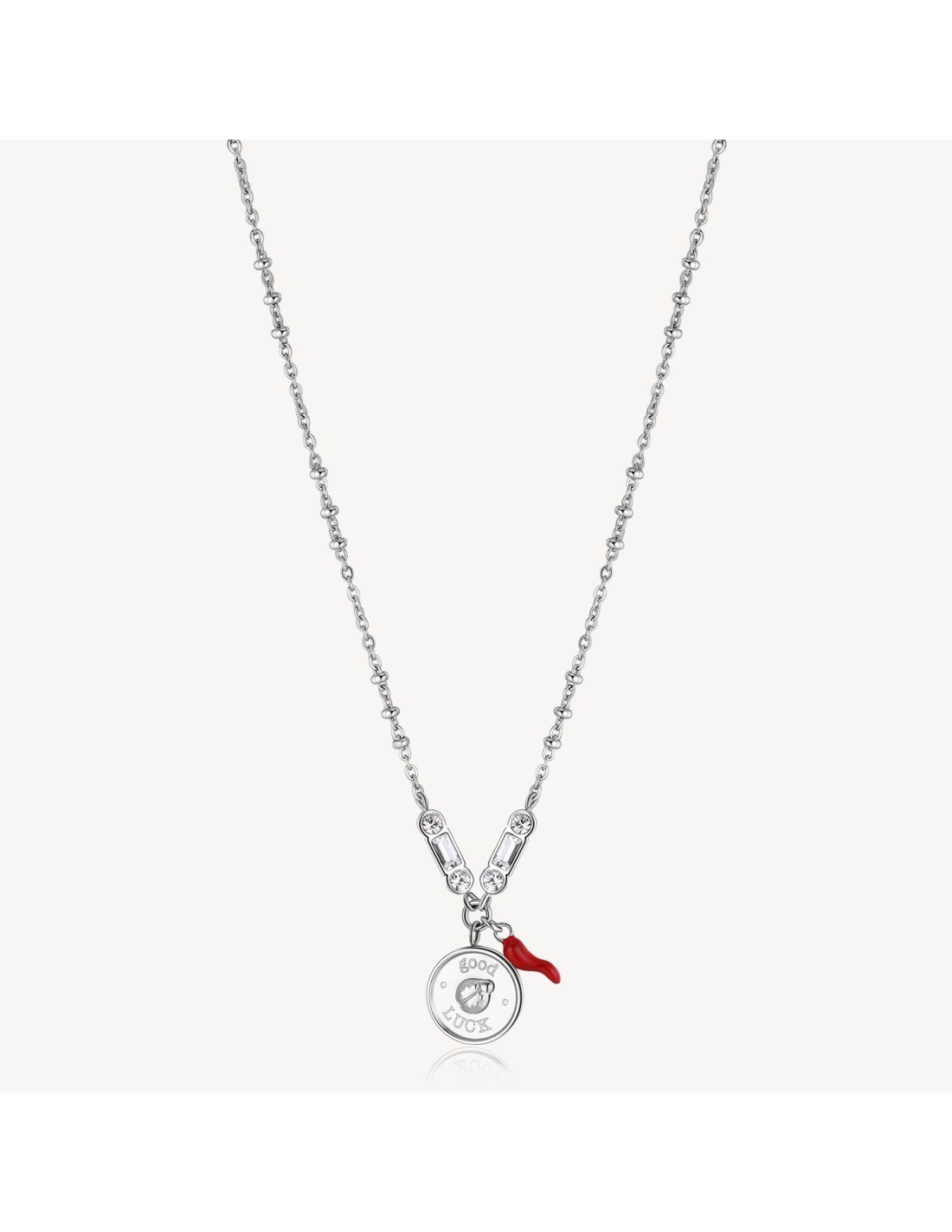 Collana girocollo in acciaio 316L con pendente a forma di cornetto in smalto rosso, coccinella con incisione e cristalli crystal.