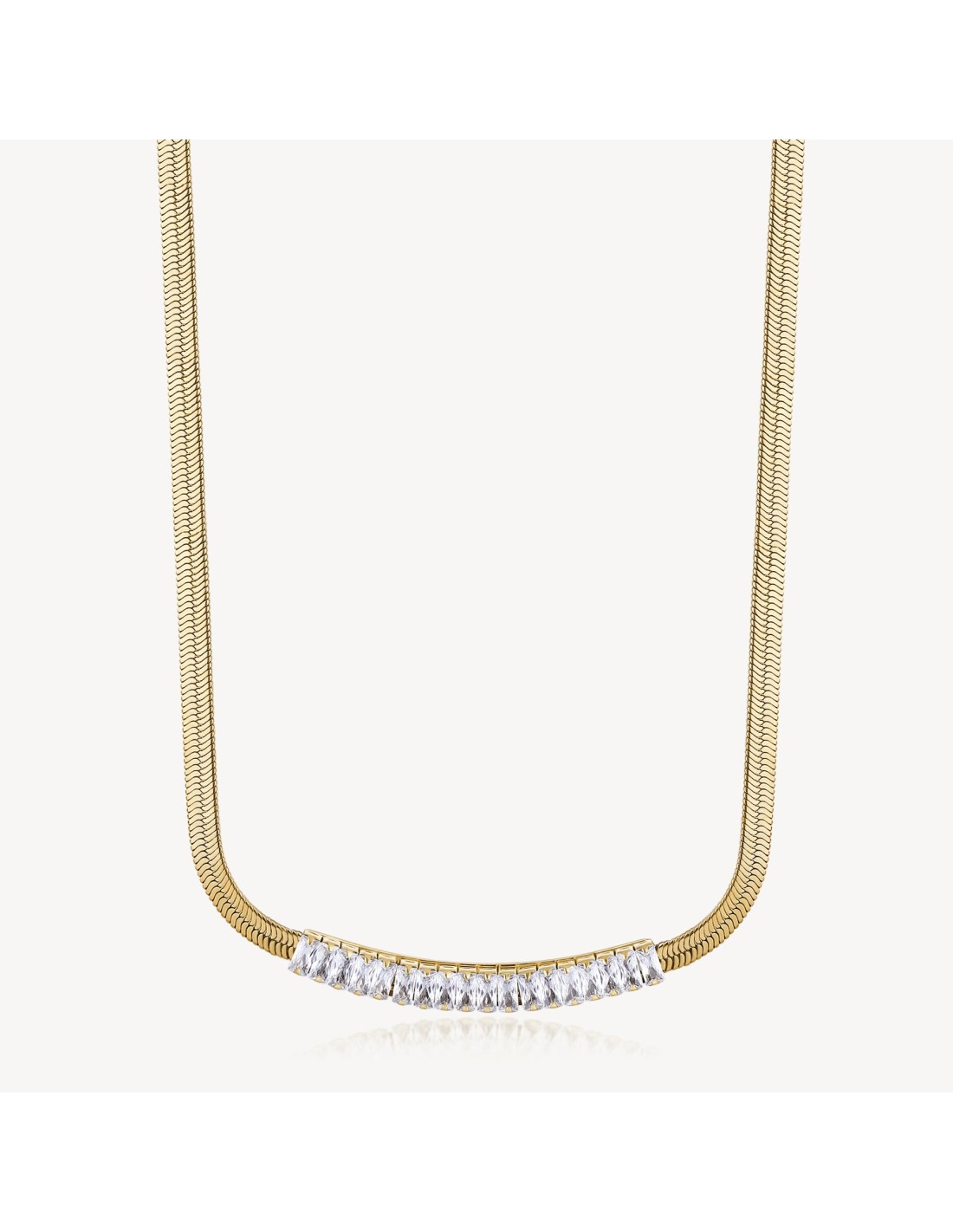 Collana girocollo catena snake in acciaio 304, finitura pvd oro 14K e cubic zirconia.