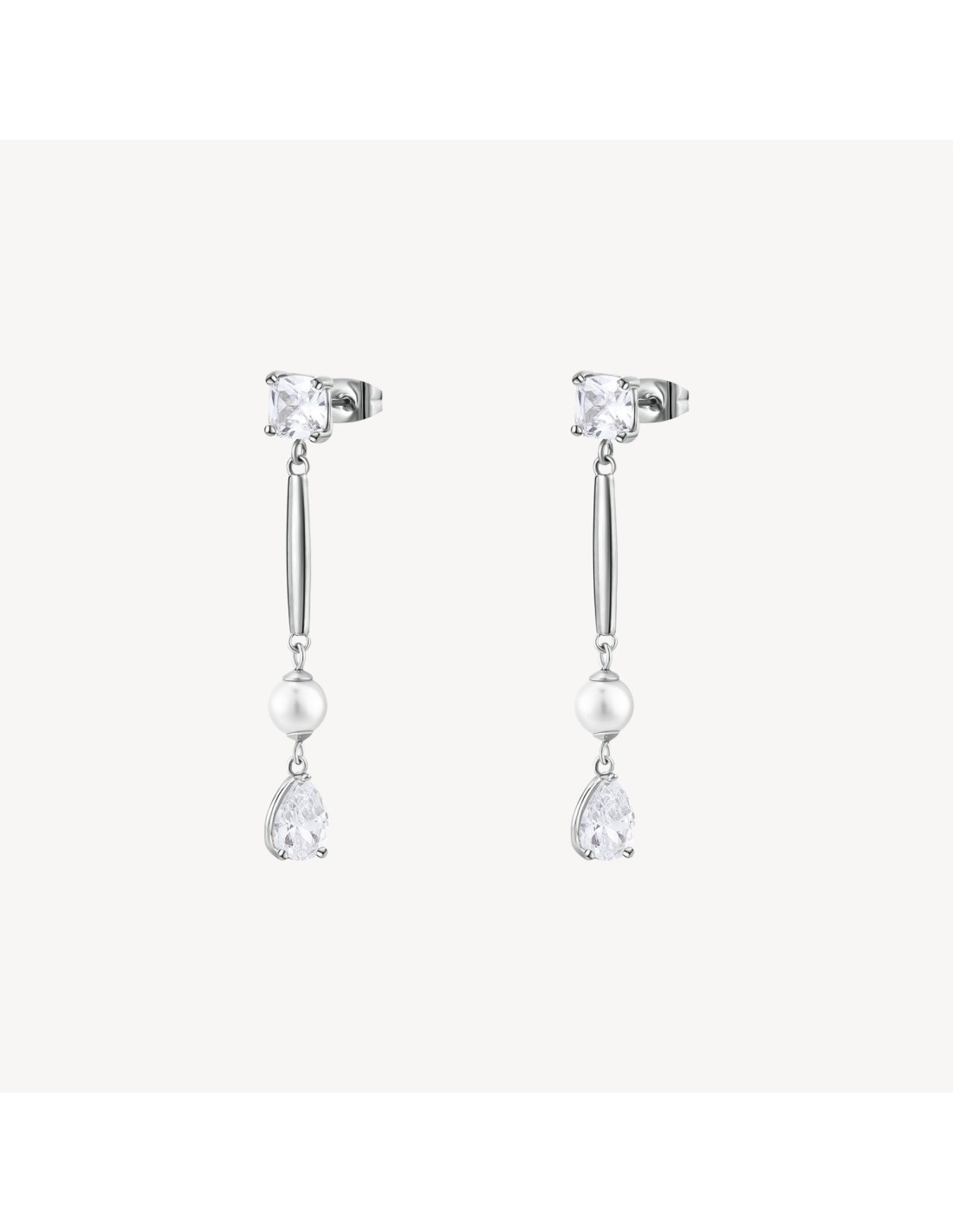 Orecchini pendenti in acciaio 316L con perle di conchiglia e cubic zirconia.