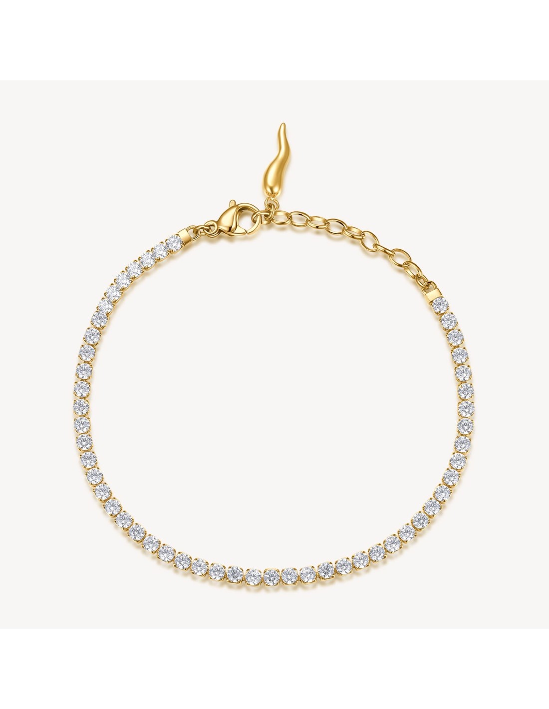 Bracciale tennis in acciaio 304 e cubic zirconia, finitura pvd oro 14K con pendente chiusura con cornetto portafortuna.