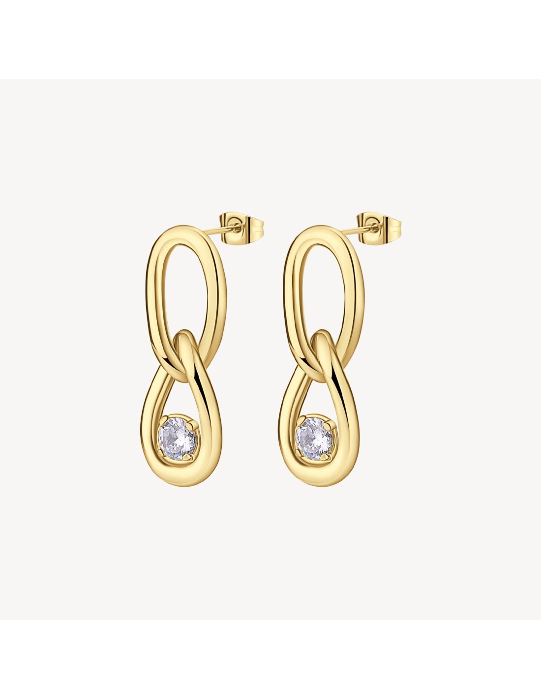 Orecchini pendenti in acciaio 316L a forma di catena e finitura pvd oro 14K con cubic zirconia.