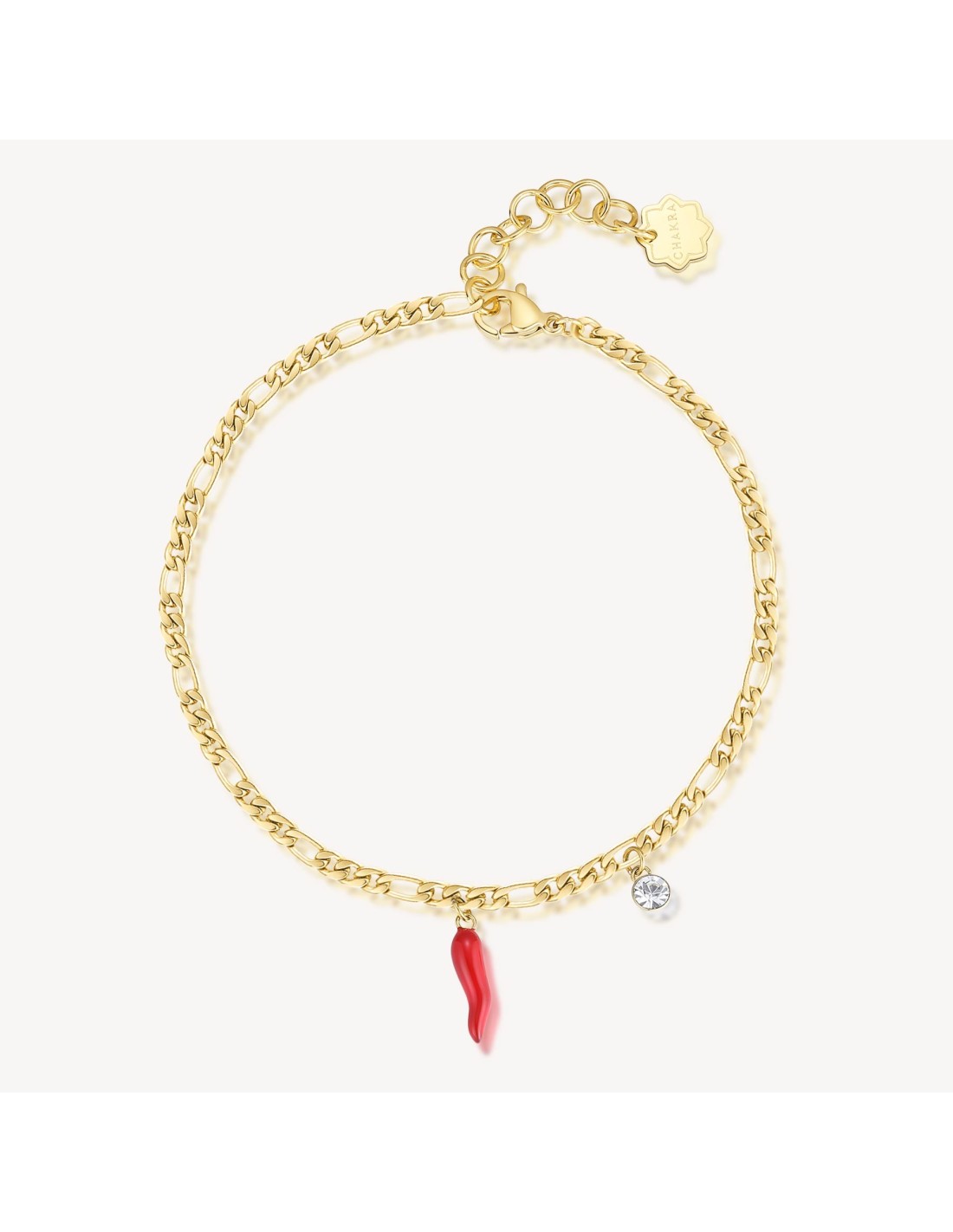 Cavigliera in acciaio 316L e finitura pvd oro 14K con pendenti a forma di cornetto in smalto rosso e cristalli.