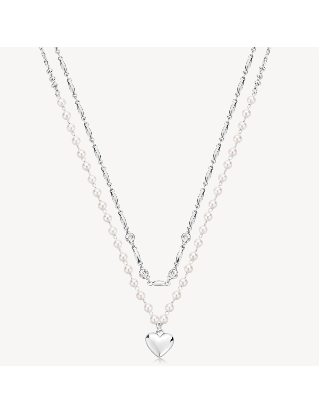 Collana girocollo doppio filo in acciaio 316L e perle di conchiglia, con pendente a forma di cuore e cristalli.