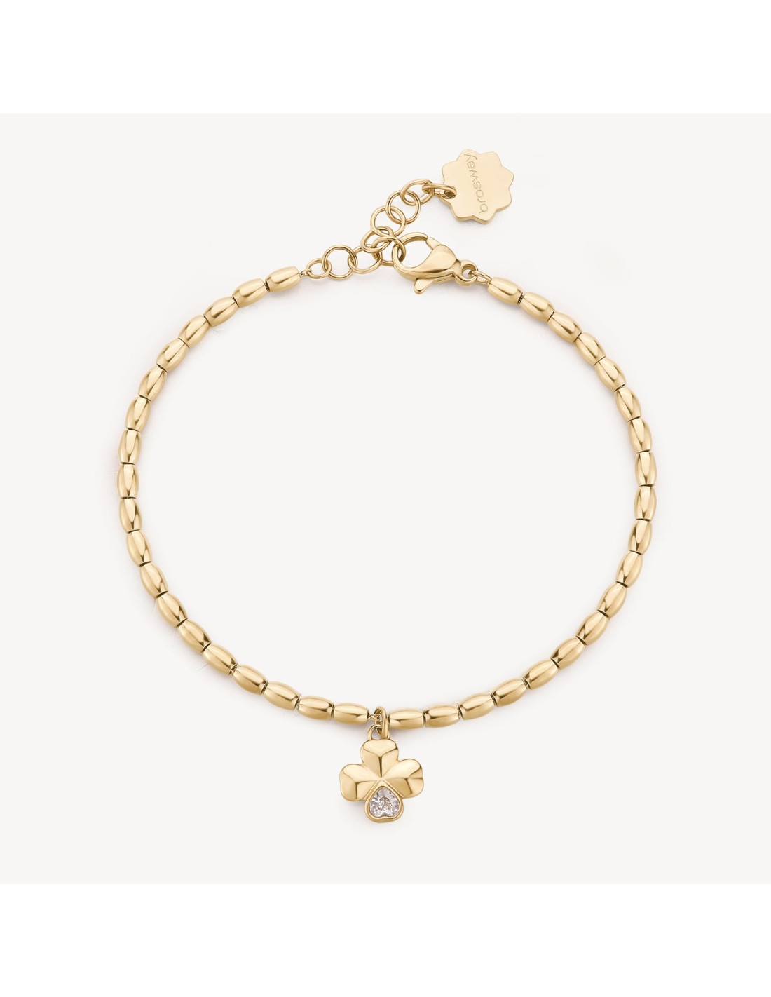 Bracciale con sfere in acciaio 316L e finitura pvd oro 14K, con pendente a forma di quadrifoglio e cubic zirconia.