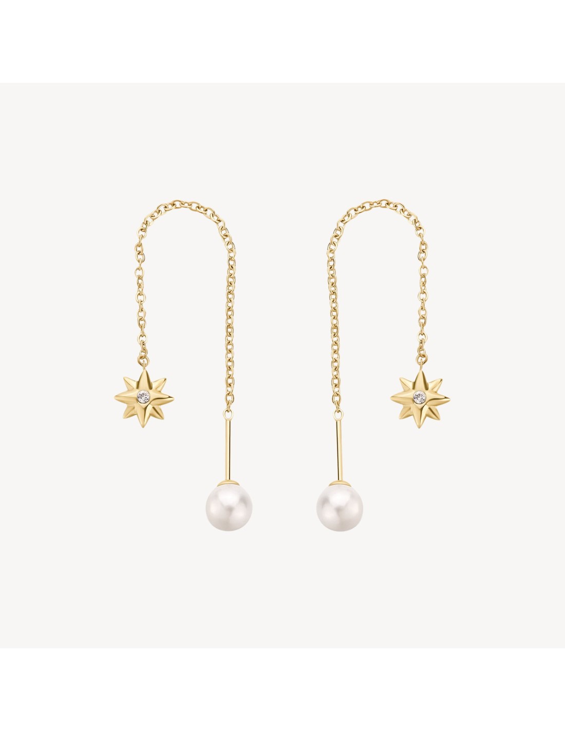 Orecchini saliscendi in acciaio 316L e finitura pvd oro 14K, con pendenti a forma di fiore di rosa dei venti, perle di conchiglia e cristalli.