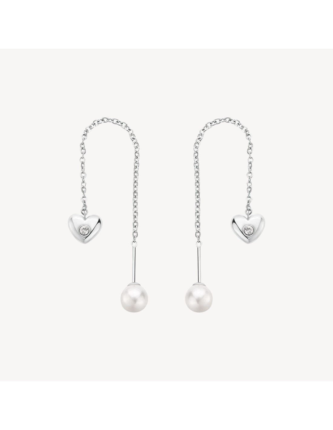 Orecchini saliscendi in acciaio 316L, con pendenti a forma di cuore, perle di conchiglia e cristalli.