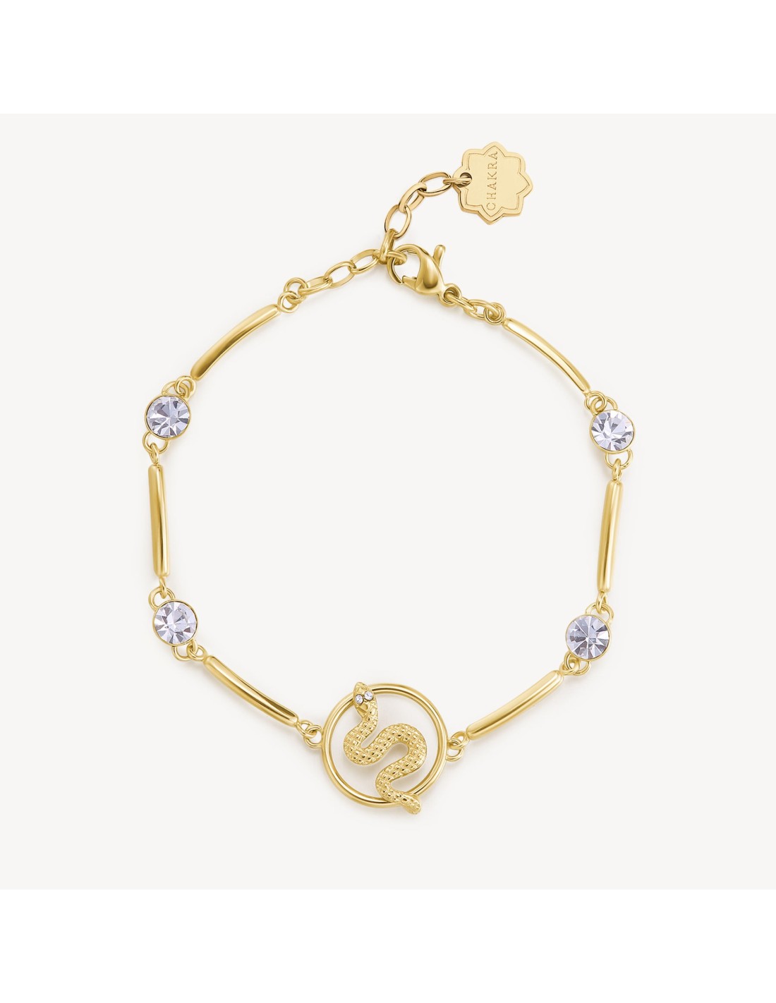 Bracciale semirigido in acciaio 316L e finitura pvd oro 14K, con centrale a forma di serpente e cristalli.