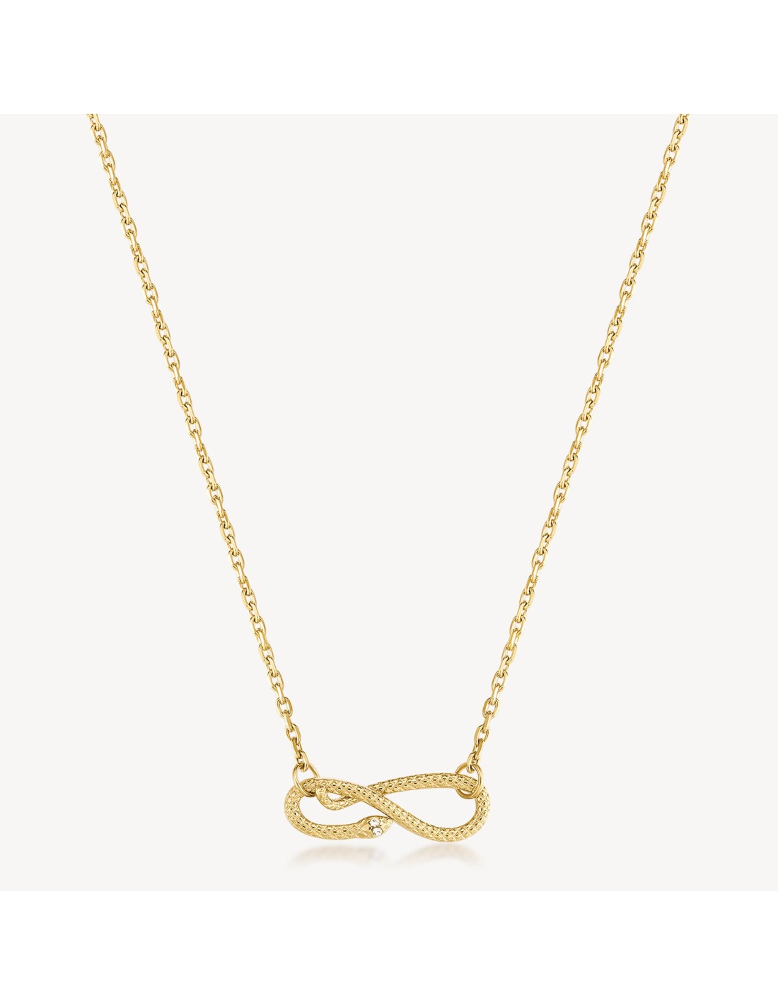 Collana girocollo in acciaio 316L e finitura pvd oro 14K, con centrale a forma di serpente e cristalli.