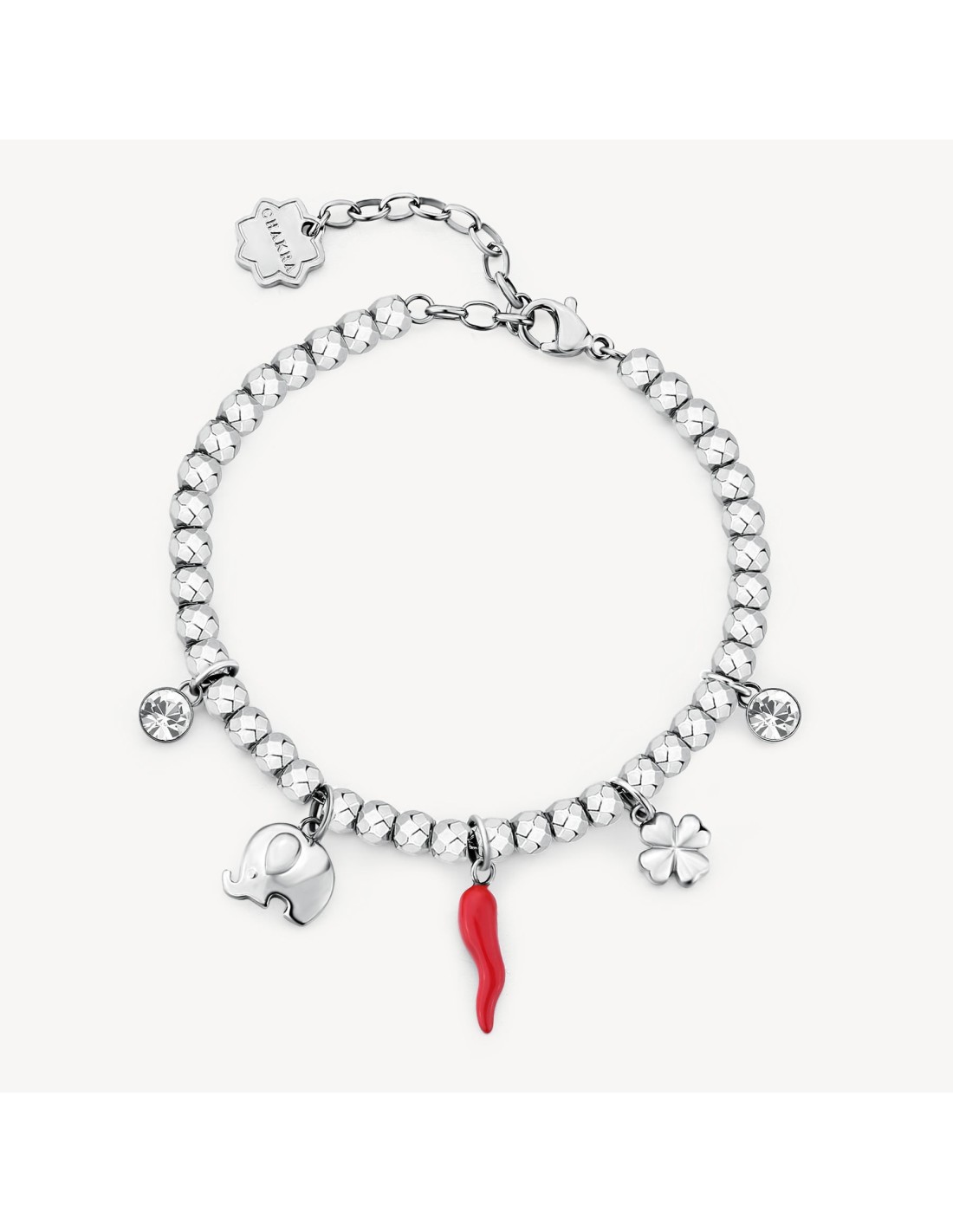 Bracciale con sfere in acciaio 316L e pendenti con elefante, quadrifoglio, cornetto con smalto rosso e cristalli.