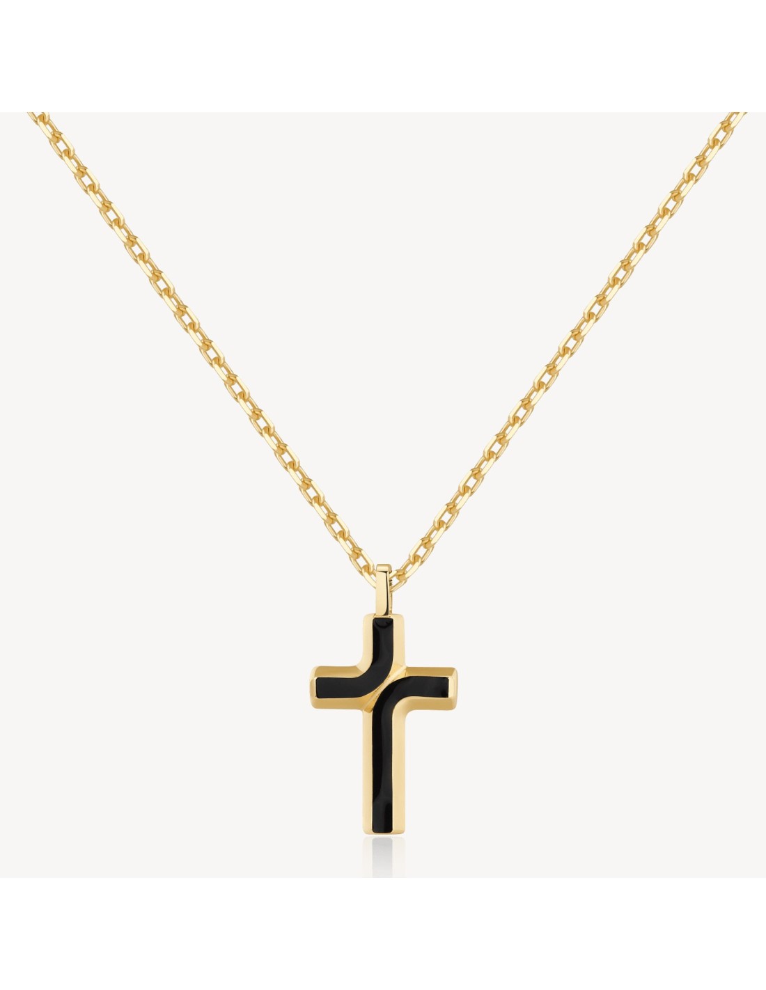 Collana in acciaio 316L e finitura pvd oro 14K con pendente a forma di croce e smalto nero.