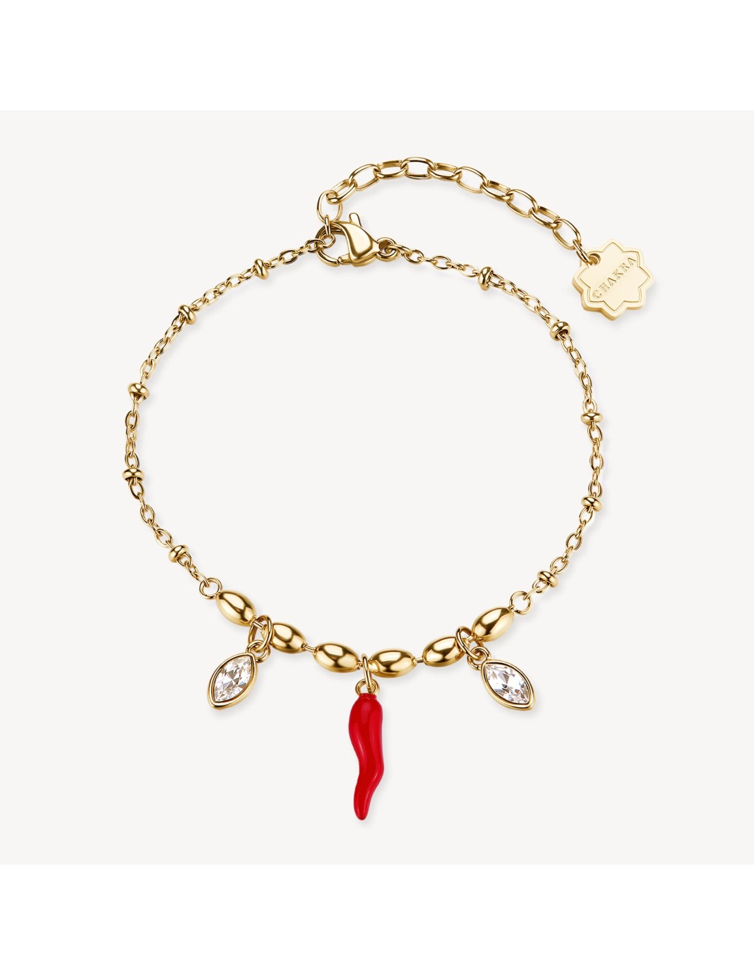 Bracciale in acciaio 316L e finitura pvd oro 14K, con pendenti con cornetto con smalto rosso e cristalli.
