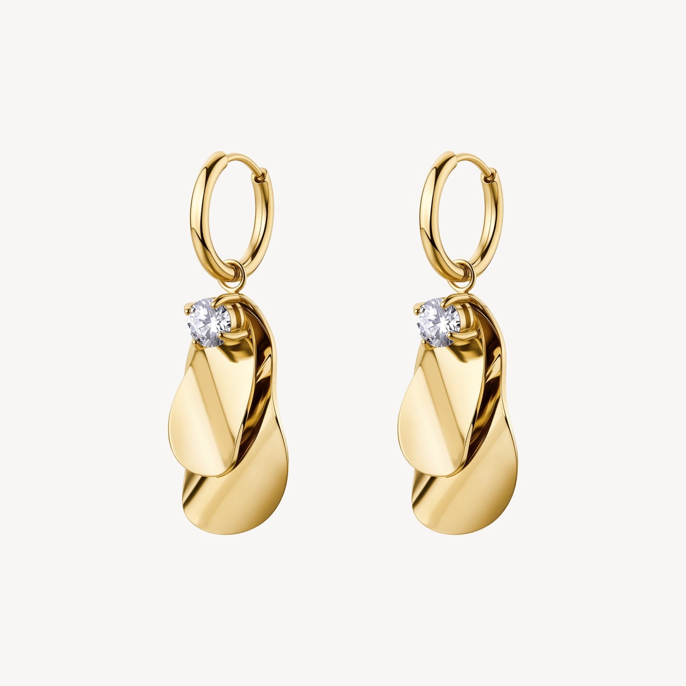 Orecchini a cerchietto in acciaio 316L dorato con pendenti e cristallo.