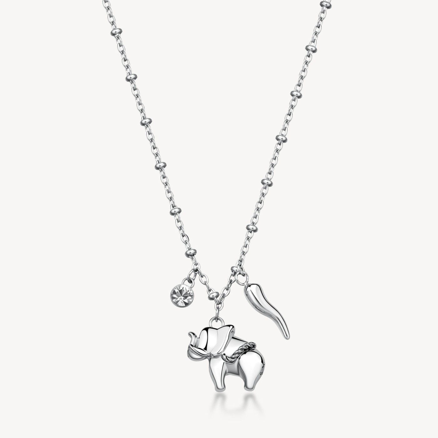 Collana in acciaio 316L con pendenti a forma di elefantino e cornetto con cristallo.