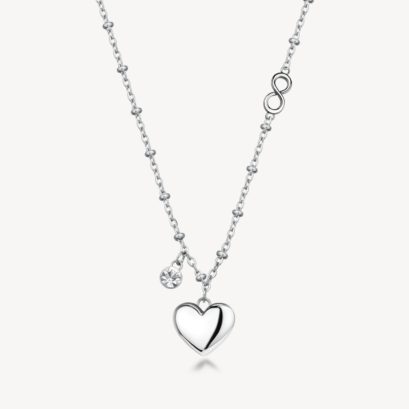 Collana in acciaio 316L con pendenti a forma di cuore, cristallo e simbolo infinito.