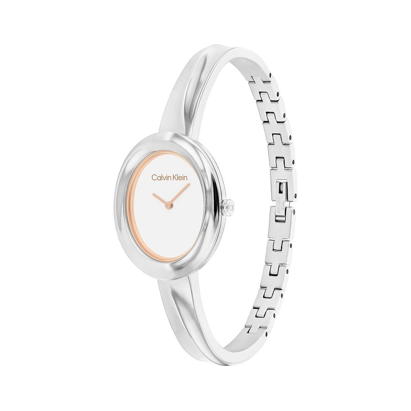 Orologio da donna di Calvin Klein della collezione Twisted Bezel. La cassa è in acciaio inossidabile di colore argento. La forma dell'orologio è tonda con quadrante di colore bianco. La cassa ha dimensioni di 26 mm. Il cinturino è in acciaio inossidabile di colore argento. Il movimento è 2h. La resistenza all'acqua è di 3 ATM.