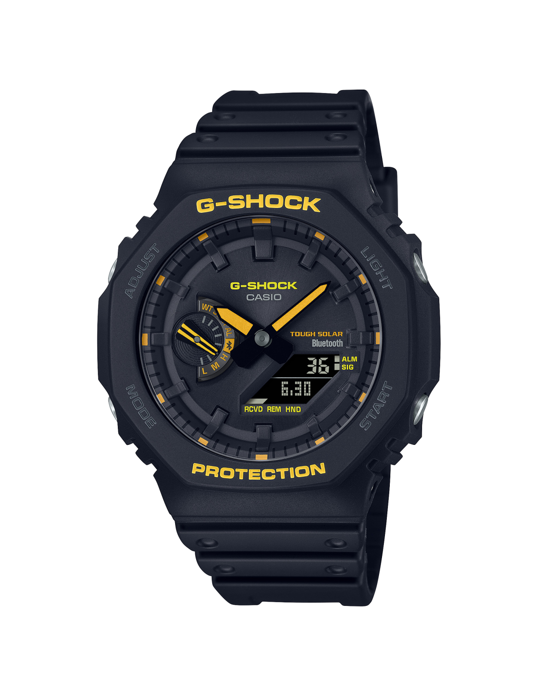 Scegli tra GA-B001 e GA-B2100, due orologi audaci e accattivanti dal look total black con accenti giallo brillante.