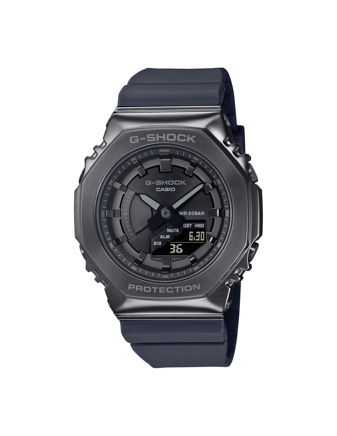 Sfoggia un look minimalista, pulito e audace con il G-SHOCK di grandezza media in una versione ottagonale rivestita in metallo dal design iconico originale. Forgiata in acciaio inossidabile con finitura a linee sottili e taglio arrotondato, la lunetta robusta trasuda uno stile eccezionale. Solo le lettere in alto e in basso sono incise, per un design semplice e monopezzo. Il quadrante, appiattito per la snellezza, è trattato con colore di placcatura ionica e indici specchiati per aggiungere una brillante profondità.