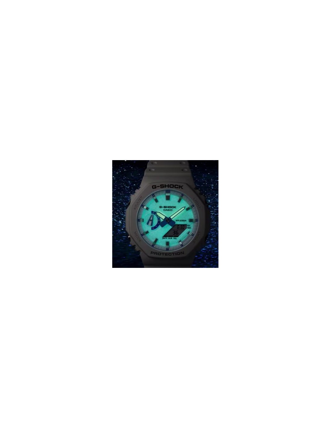 Il quadrante blu fosforescente dell'orologio si illumina magicamente di notte, evocando il luccichio del plancton bioluminescente che galleggia nel mare. Abbinato a uno schema di colori bianco e blu, il design cattura magnificamente la trasformazione dinamica della spiaggia dalla brillantezza del sole diurno alle morbide sfumature notturne.