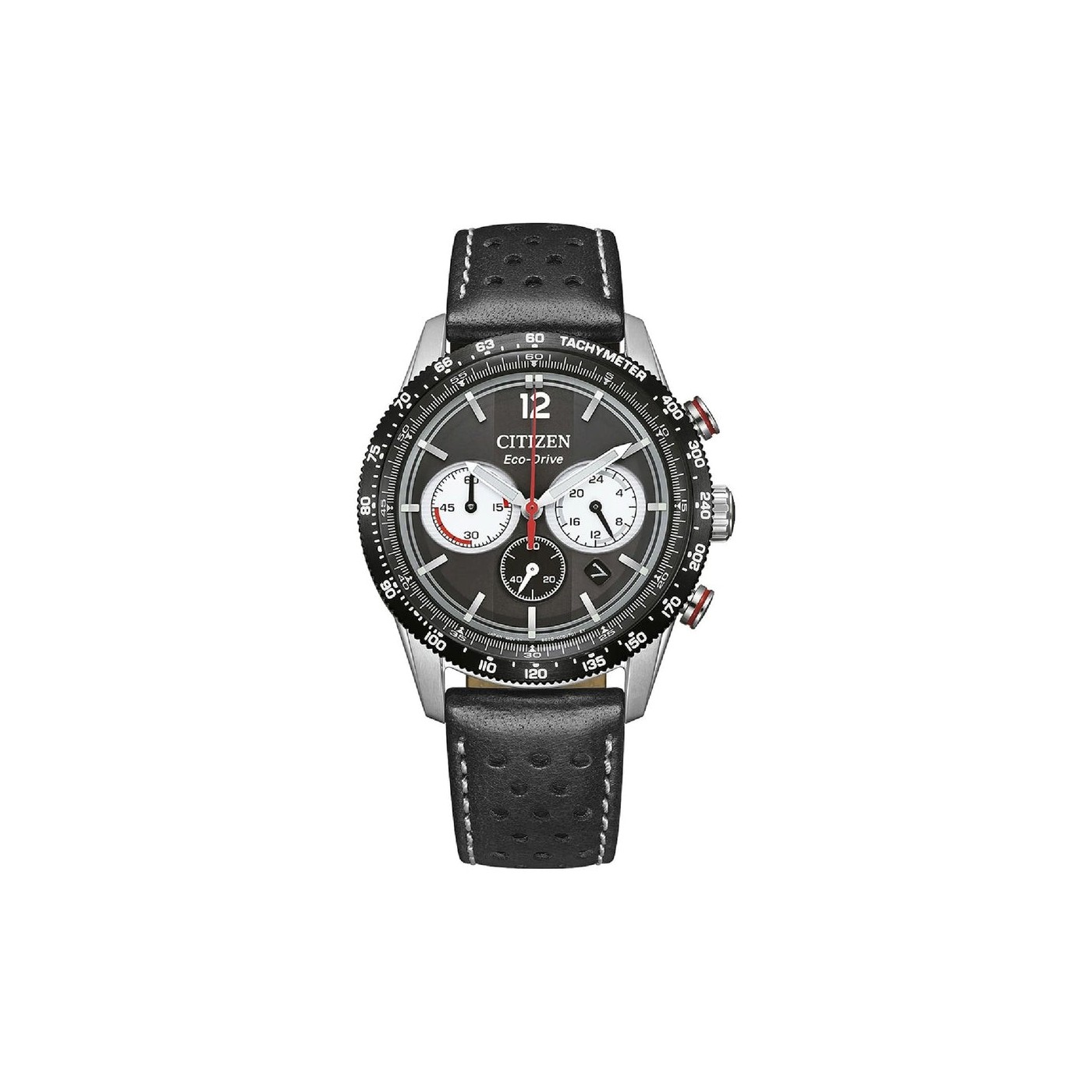 Orologio cronografo Eco-drive della collezione Citizen Vintage Racing da uomo. Colore cassa: argento; colore del quadrante: nero; colore del cinturino: nero. Cassa di diametro 39 mm in acciaio inossidabile 316L con datario sul quadrante. Vetro minerale. Cinturino in pelle. Fondello a vite. Movimento solare riserva di carica di 270 giorni. Classificazione di impermeabilità (WR) 10 bar: adatto al nuoto, allo yachting, allo snorkeling, alla nautica.