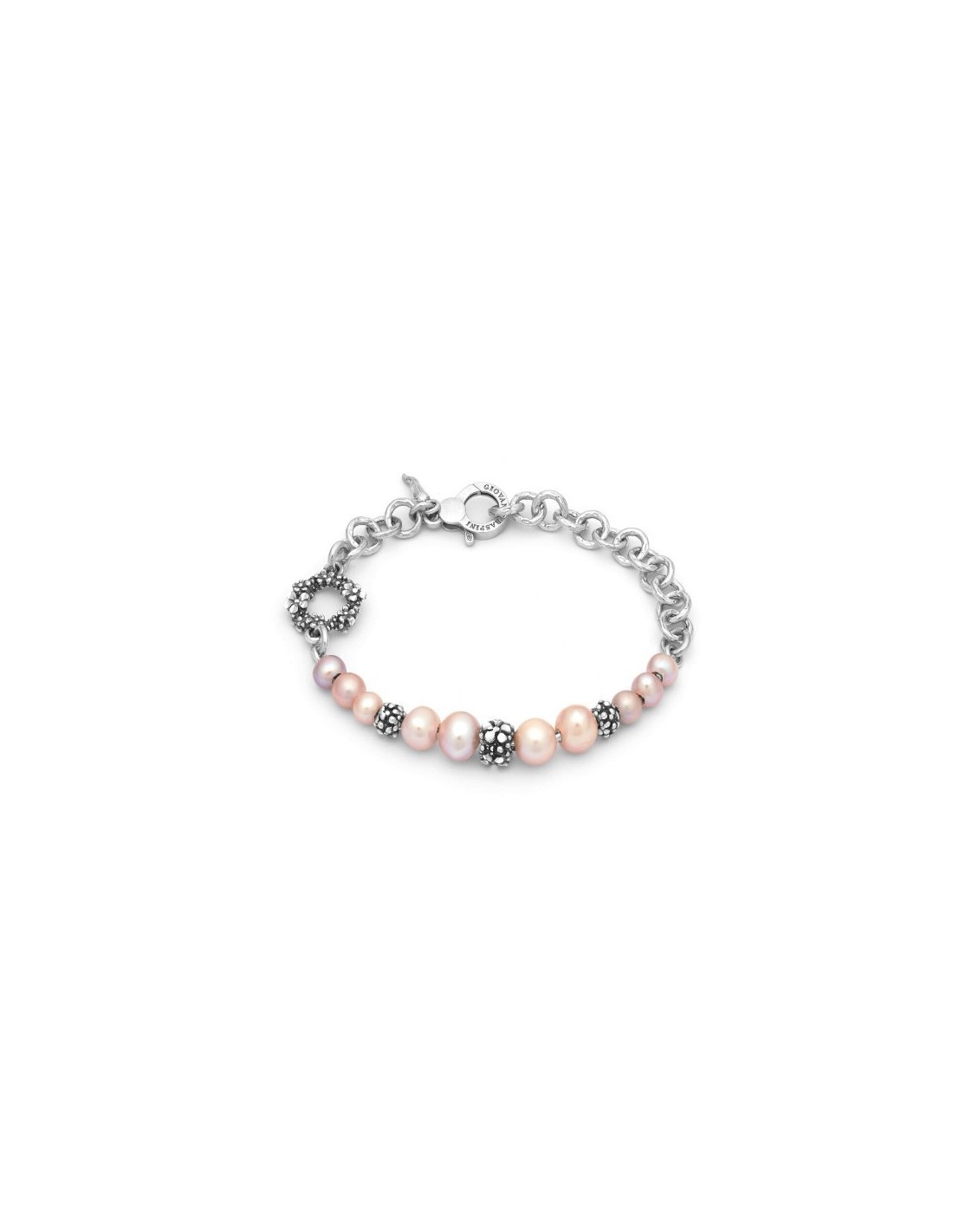 Piccole e deliziose perle rosa naturali d'acqua dolce, alternate ad inserti floreali in argento brunito e diamantato e ad una catena martellata, danno vita a questo bracciale che sa di primavera. Realizzato a mano in azienda.