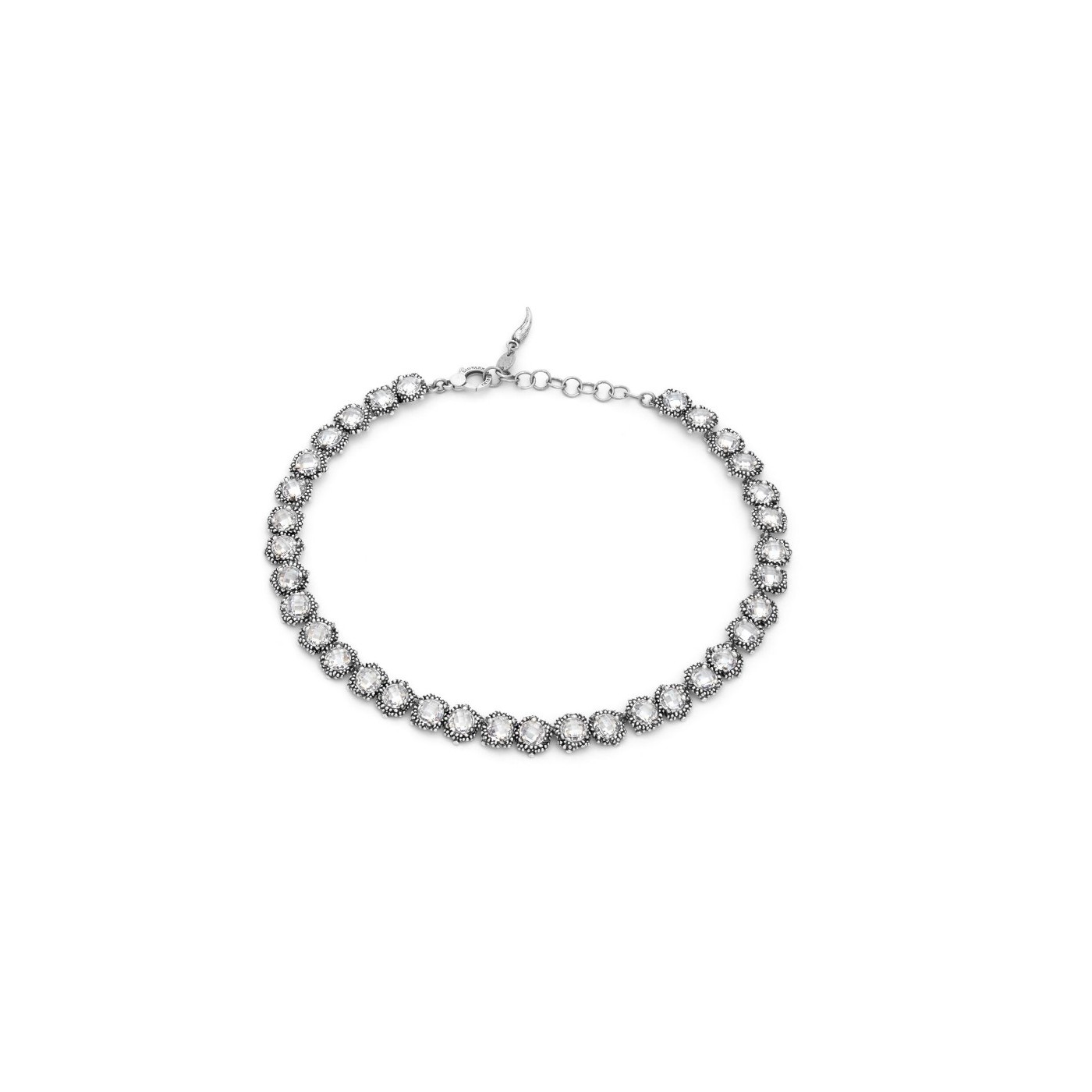 In questa collana in argento brunito, la luminosità purissima degli zirconi trasparenti e la bellezza contemporanea del decoro stile Perlage, danno vita ad un gioiello elegante e versatile. Realizzato completamente a mano in azienda.