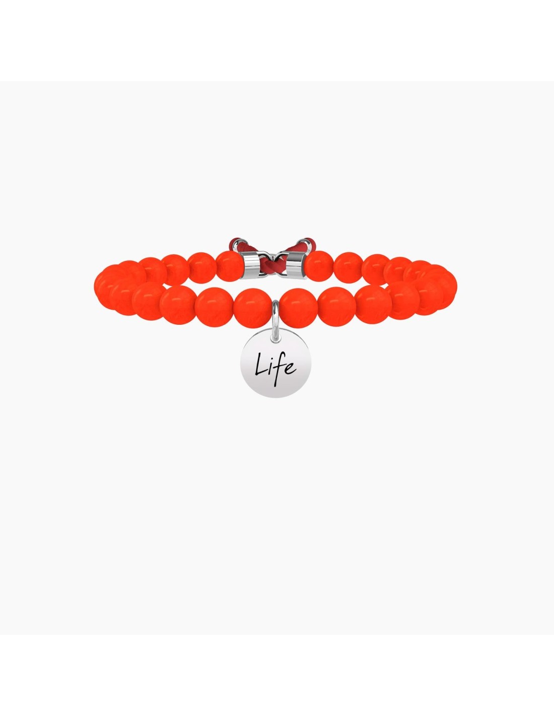 Bracciale elastico con sfere in corallo bambù rosso e dettagli in acciaio.