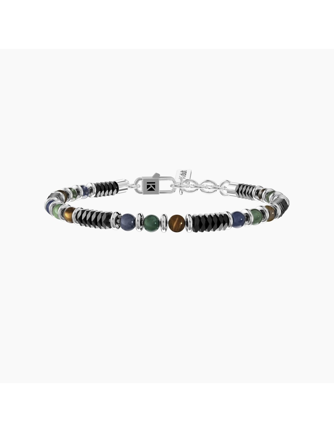 Bracciale uomo regolabile in acciaio con giada, occhio di tigre, sodalite blu ed ematite faccettata.