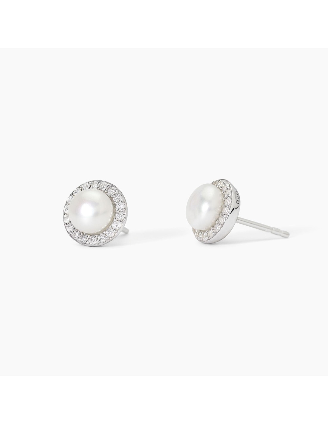 Orecchini da donna a lobo in argento rodiato con perle coltivate e zirconi bianchi.
