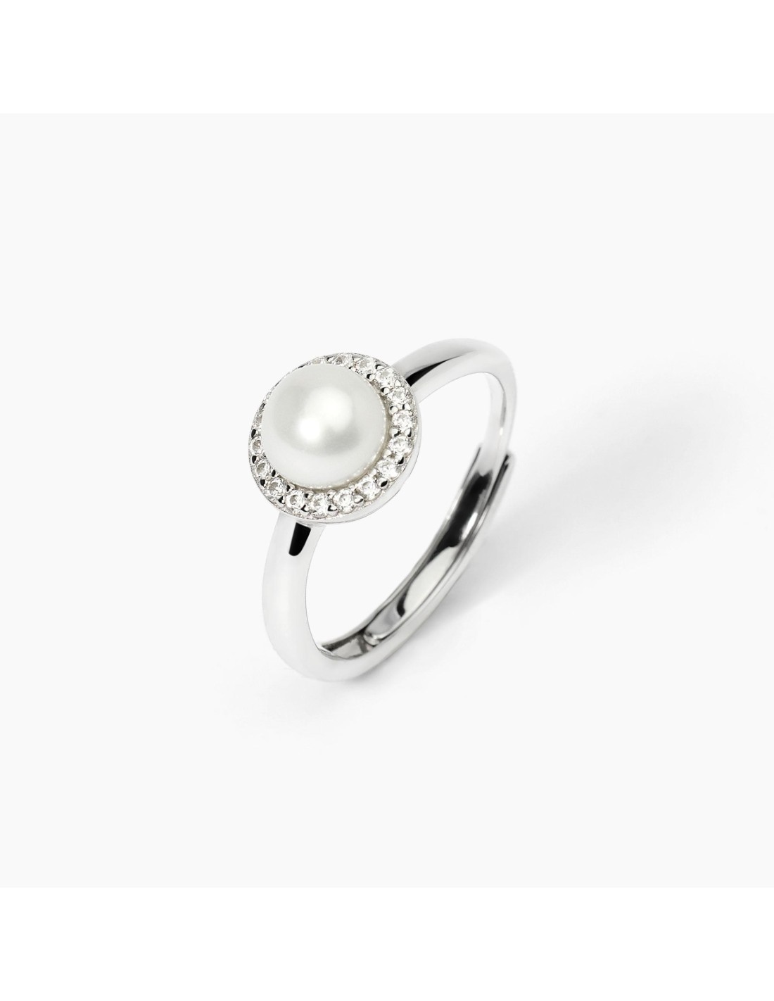 Anello da donna regolabile in argento rodiato con perla coltivata e zirconi bianchi.