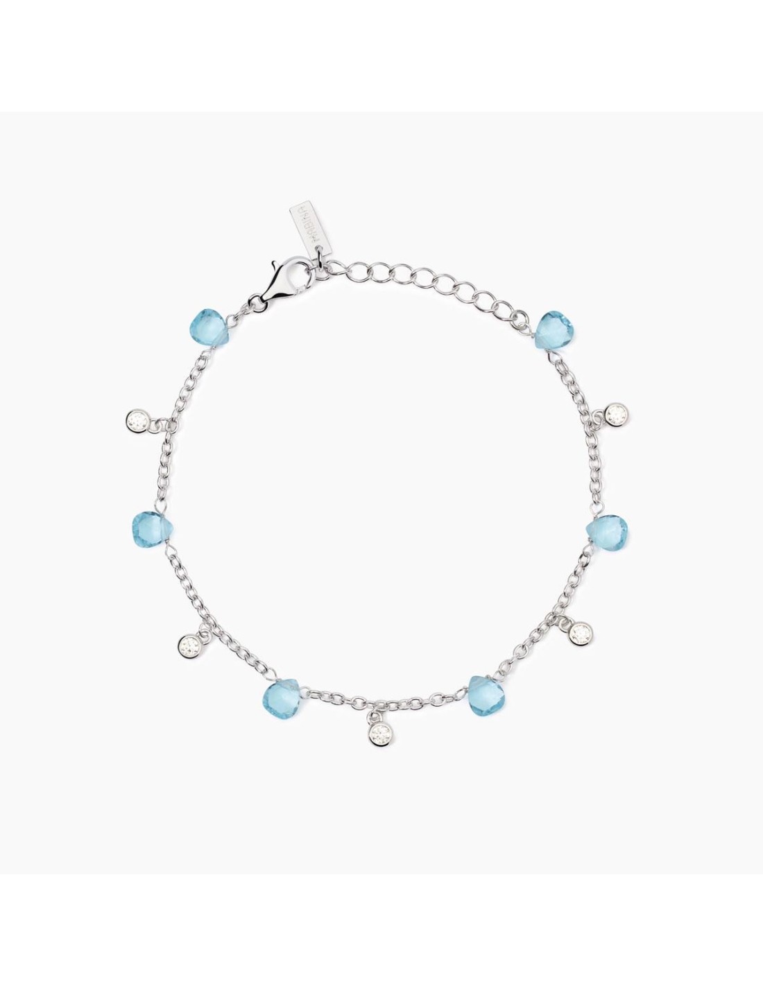 Bracciale regolabile da donna in argento rodiato con catena forzatina, elementi in glass azzurro taglio goccia e zirconi.