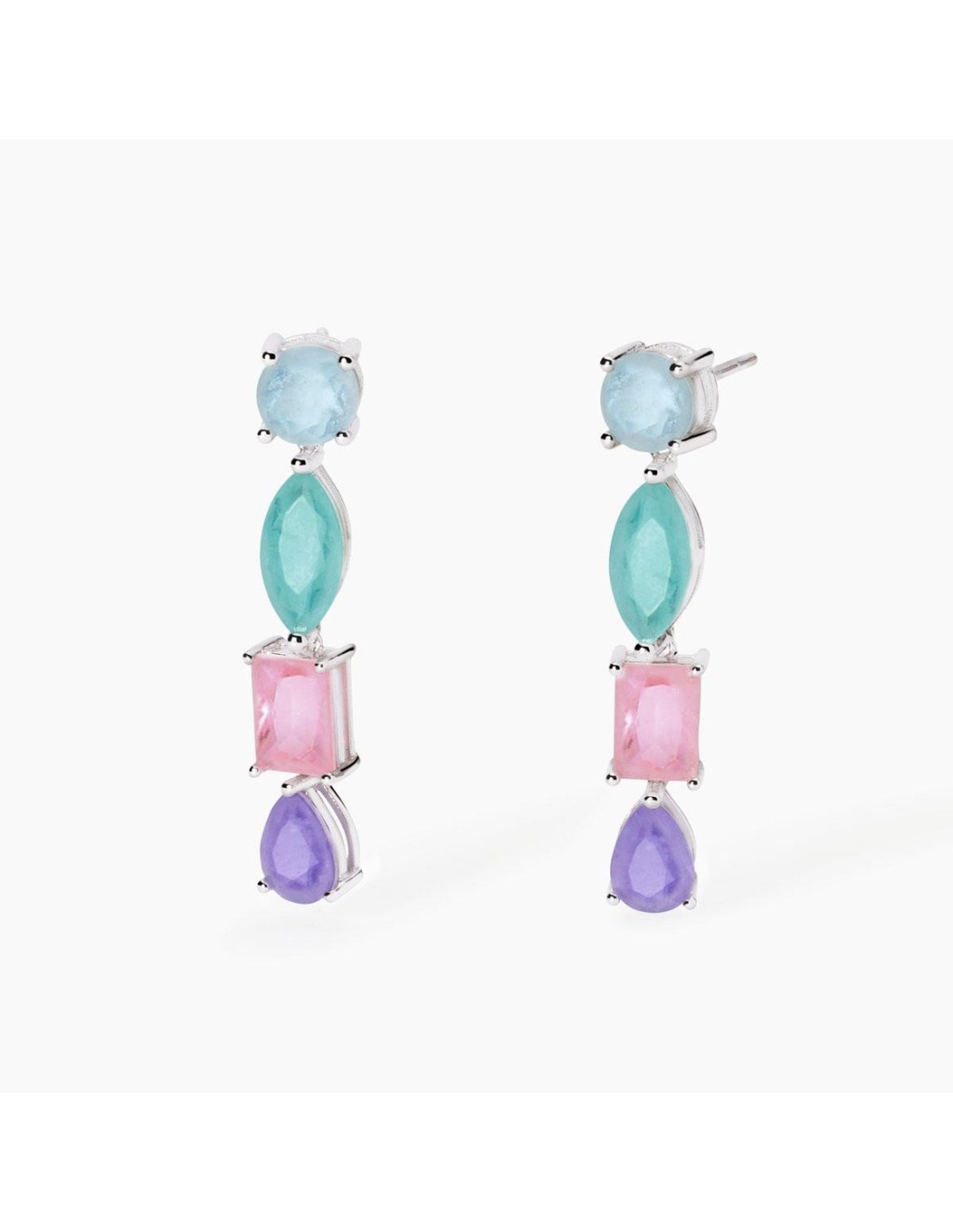 Orecchini da donna in argento rodiato con elementi in fusion stone multicolor. Elementi in glass e cristallo di rocca in differenti tagli.