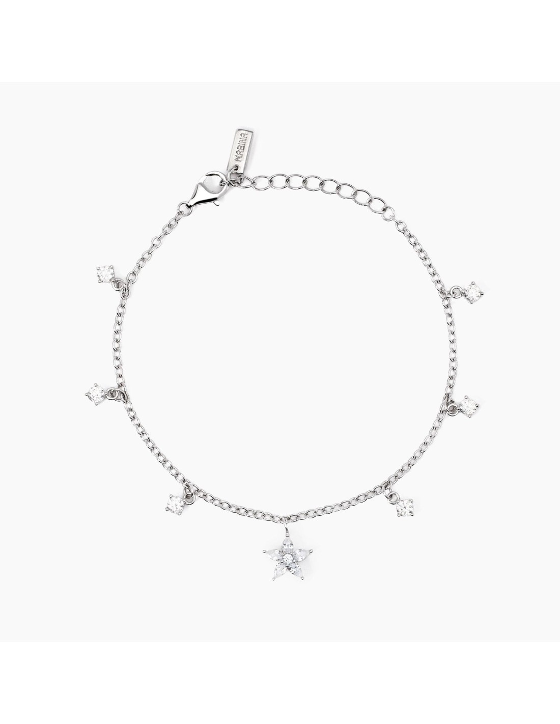 Bracciale regolabile da donna in argento rodiato con catena rolò, zirconi pendenti e ciondolo centrale a forma di fiore con zirconi.