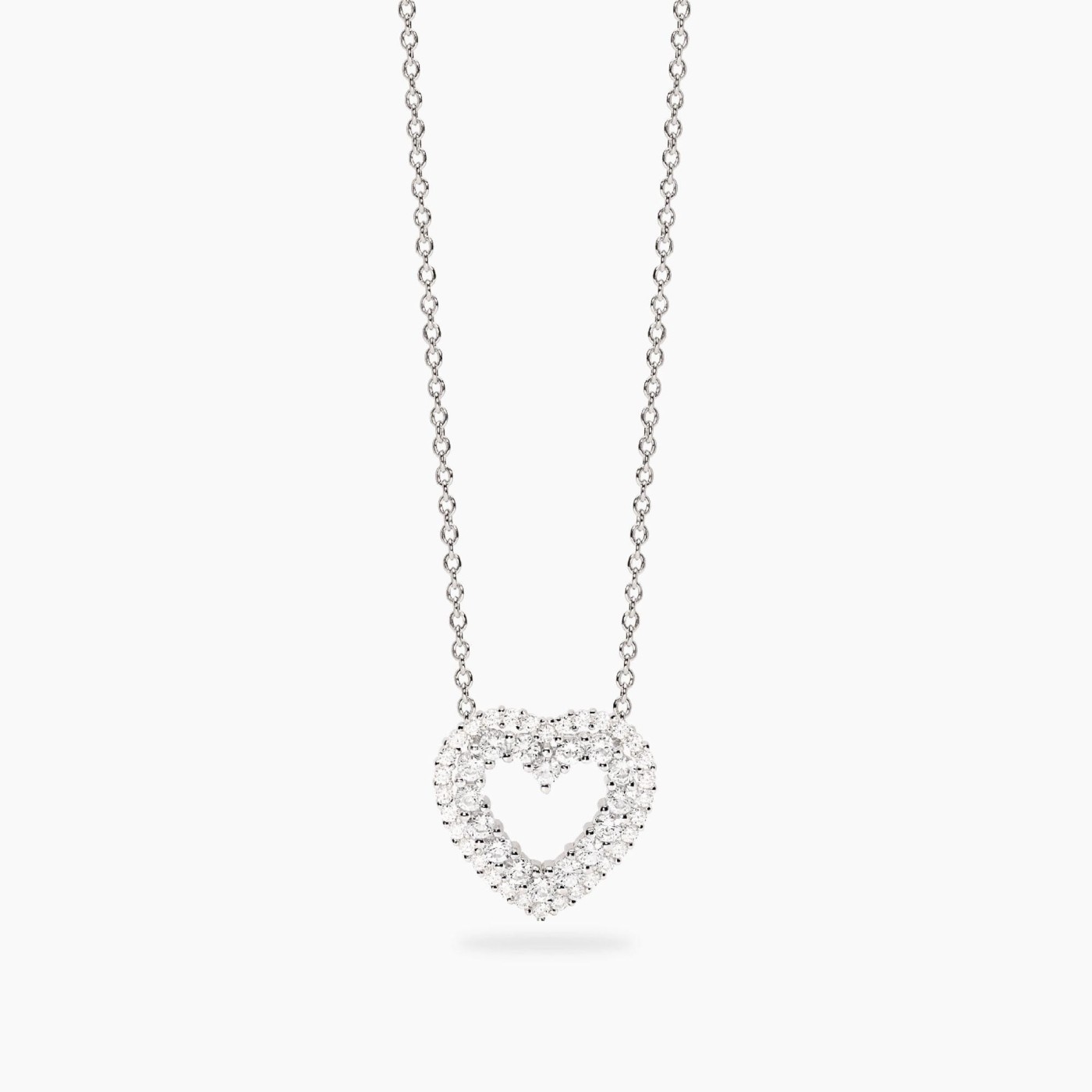 Girocollo in argento rodiato con catena rolò e pendente cuore in zirconi bianchi.