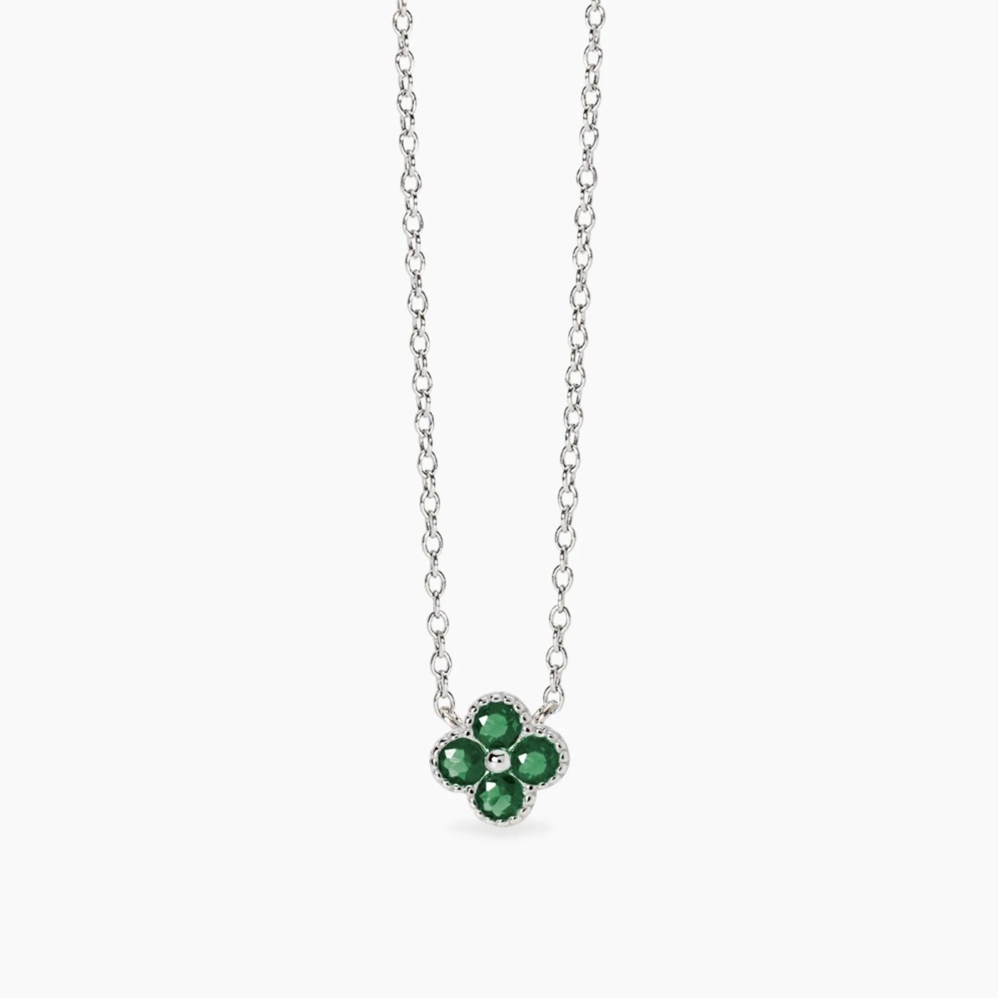 Collana donna mabina, 553795, collezione argento donna, in argento con catena rolò e ciondolo fiore in smeraldo sintetico. Dimensione catena: 1, 3 mm Dimensione fiore: 9x9 mm Diametro smeraldi sintetici: 3 mm Misura regolabile dalla 39 alla 43 cm