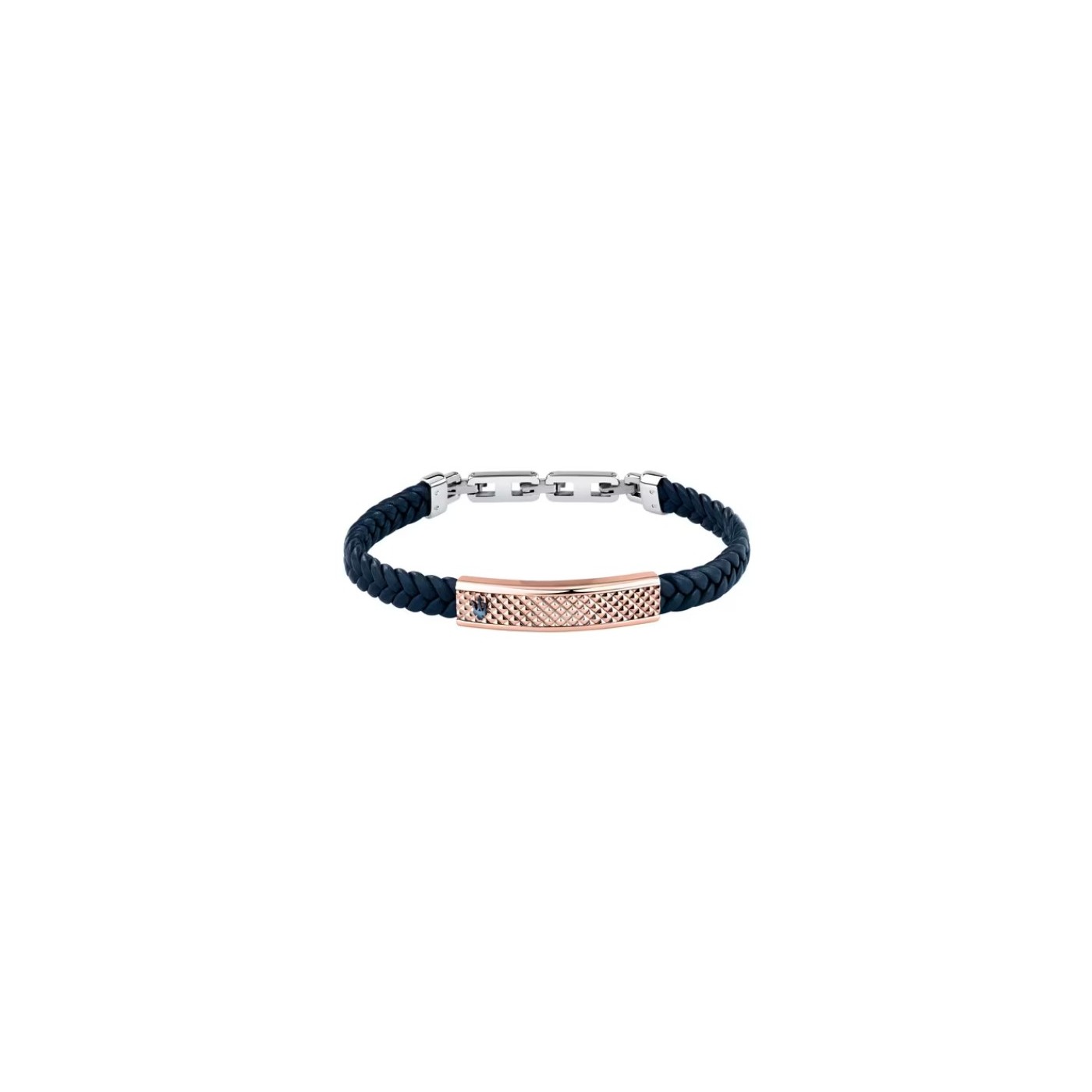 BRACCIALE MASERATI RECYCLED LEATHER - JM525AVE35 - Genere: Uomo, Misura: 19|3.5, Colore: Rose-gold, Blu, Bluespirit experience: Fashion, Modello: Rigido, Materiale: Acciaio, Peso: 23,000 gr, Certificato di autenticità: Sì, Confezione: Originale Maserati
