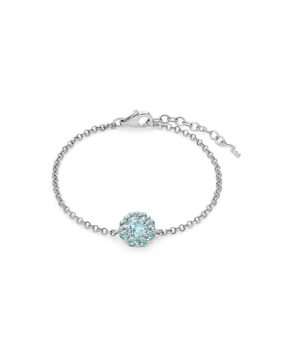 Bracciale catena della collezione Miluna Gemma del Cielo da donna. Colore: argento e azzurro. Il gioiello è in argento 925 rodiato impreziosito da un topazio azzurro naturale taglio brillante 6 mm posizionato al centro e da 8 topazi azzurri naturali taglio brillante, posizionati a forma di fiore. La caratura totale è di 11,2 ct. Chiusura a moschettone.