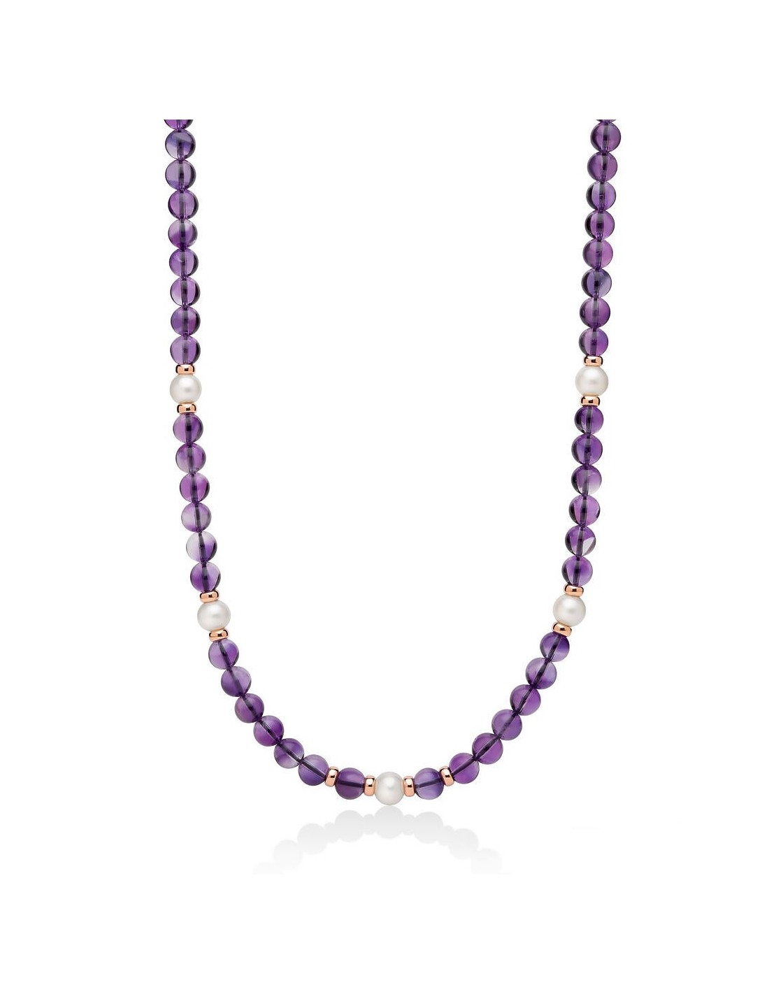 Collana da Donna Miluna con sfere in Ametista Da 8 mm, 5 Perle LR da 8,5-9 mm, Elementi in argento placcato oro rosa e chiusura a moschettone in argento 925 con Elemento forma cuore con logo Miluna in Oro Rosa.