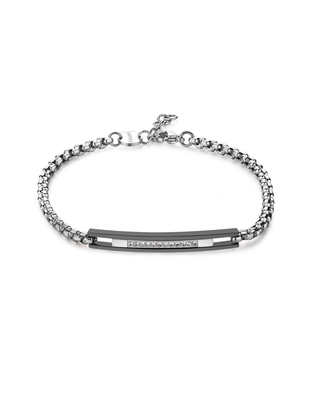 Bracciale in acciaio 316L con catena rolò quadrata e centrale con finitura pvd colore rutenio e cristalli.