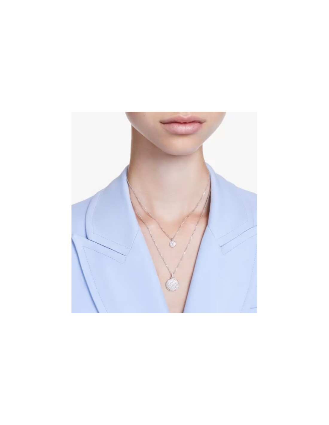 Questo scintillante pendente stratificato è il mezzo ideale per far risplendere il tuo stile di pura luce. Il design placcato rodio presenta due catene, ciascuna con un motivo a cupola a forma di meteora, splendidamente impreziosito da un pavé a neve di cristalli Cry rotondi di diverse dimensioni. Per un tocco di versatilità in più, il pendente può essere invertito, rivelando un alone di cristalli attorno al motivo più grande ed un singolo cristallo al centro del motivo più piccolo. Unidea regalo meravigliosa per te o per una persona che ami.