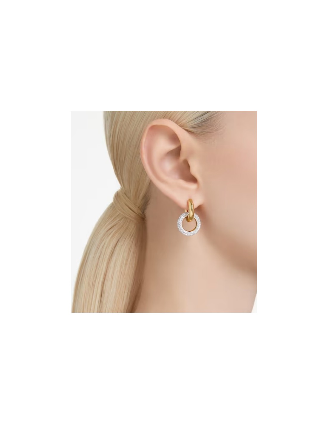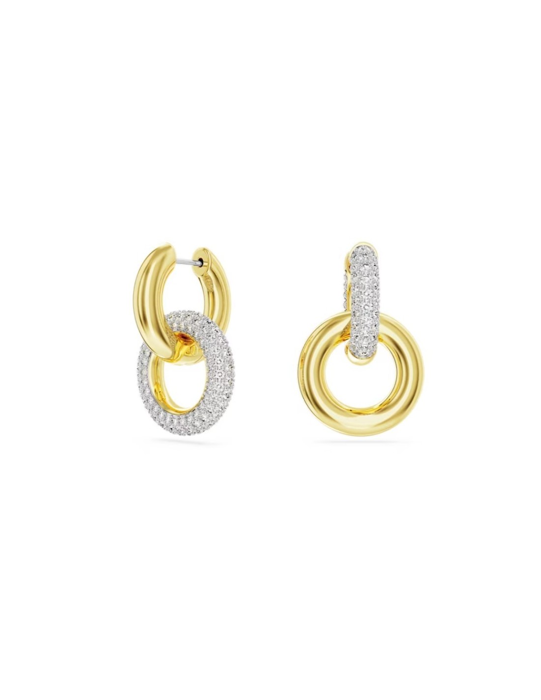 Questi orecchini a cerchio intrecciati della famiglia Dextera presentano due anelli tubolari placcati color oro, di cui uno impreziosito da un pavé di cristalli all-over. Per un ulteriore tocco asimmetrico, gli anelli sono disposti in modi diversi su ciascun gioiello. Inoltre, è anche possibile rimuovere il secondo cerchio per uno stile a cerchio singolo che offre una maggiore versatilità.