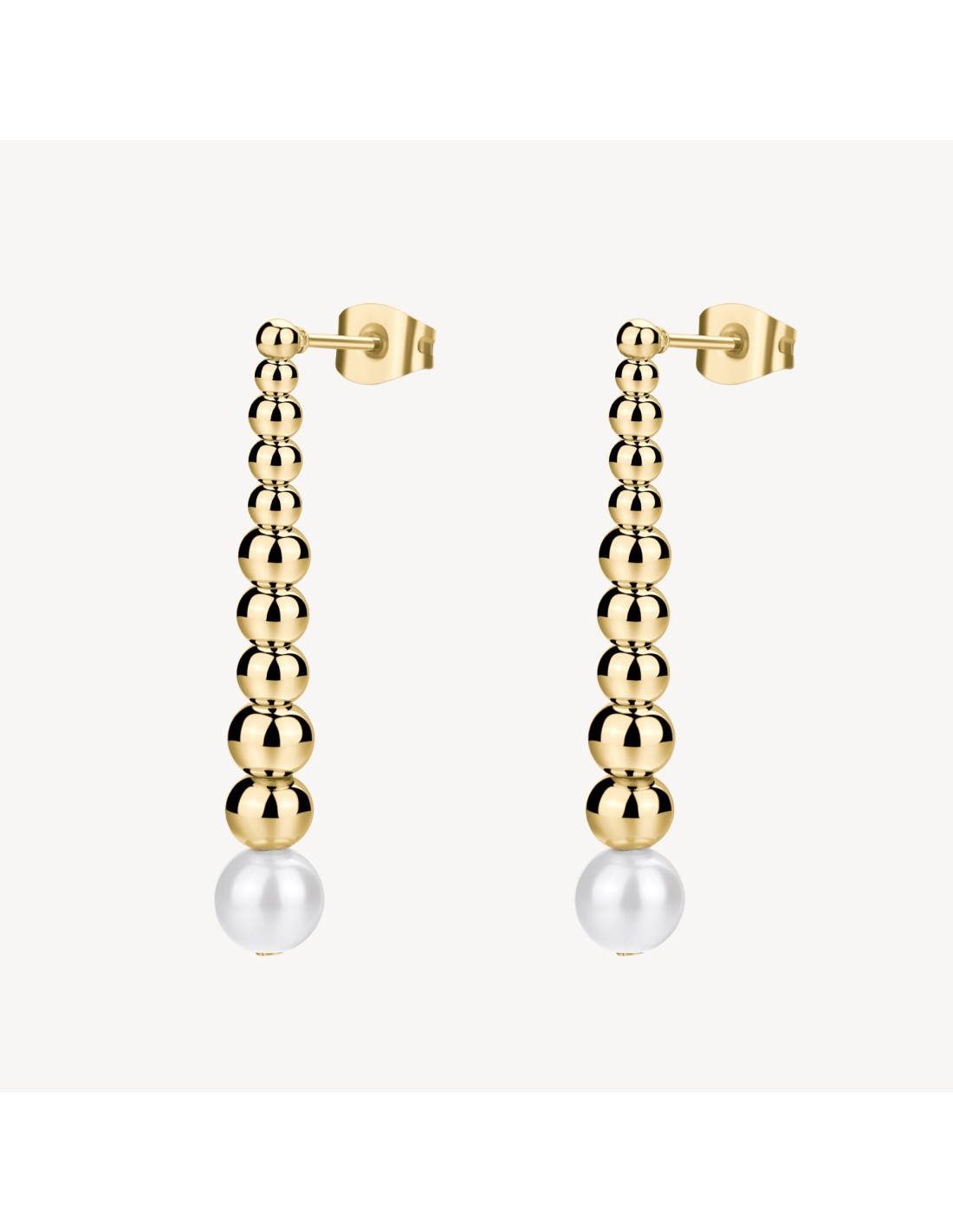 Orecchini pendenti in acciaio 316L e finitura pvd oro 14K, con perla di conchiglia.