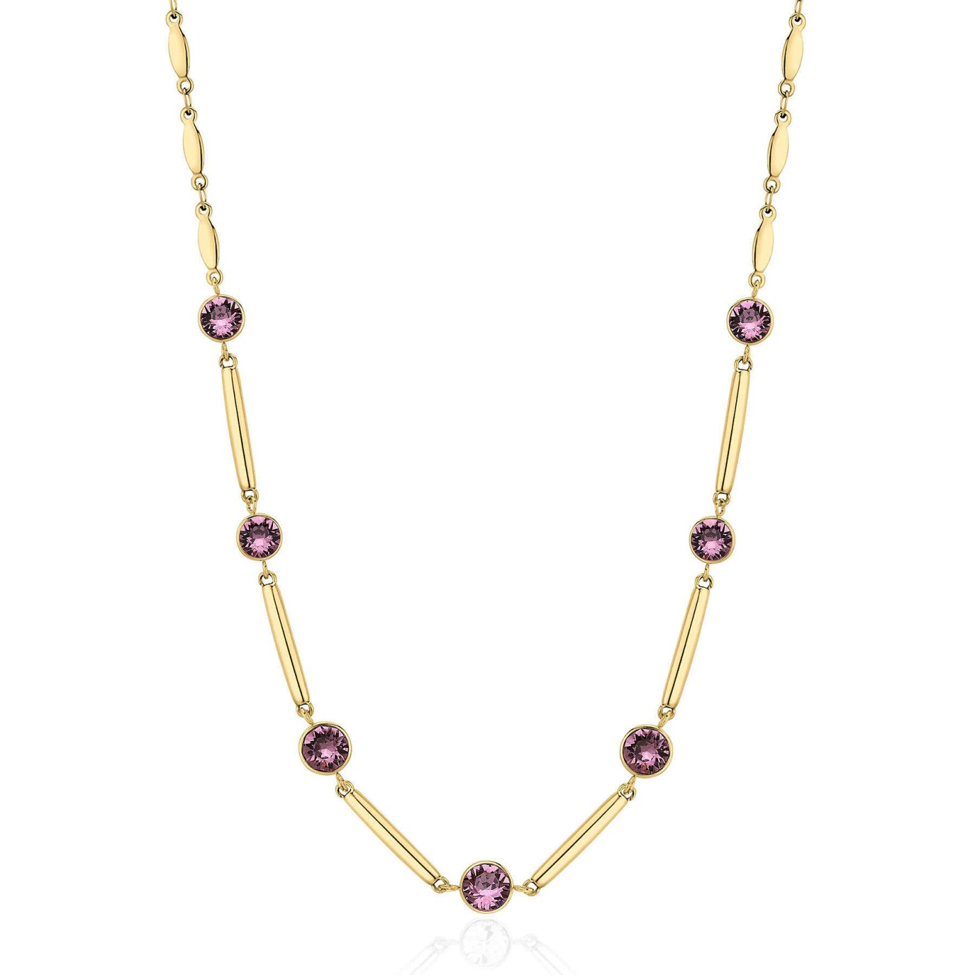 Il gioiello è in acciaio inossidabile 316L con trattamento pvd oro, caratterizzato nella parte centrale da barrettine alternate a cristalli Swarovski© iris.