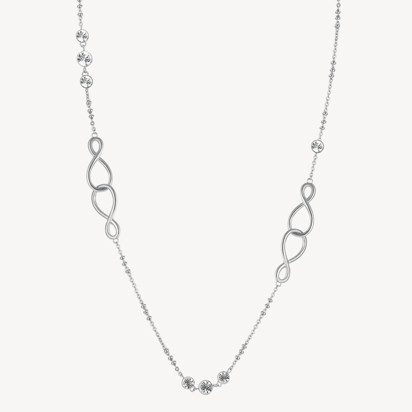 Collana lunga in acciaio 316L con cristalli e dettagli a forma di infinito.
