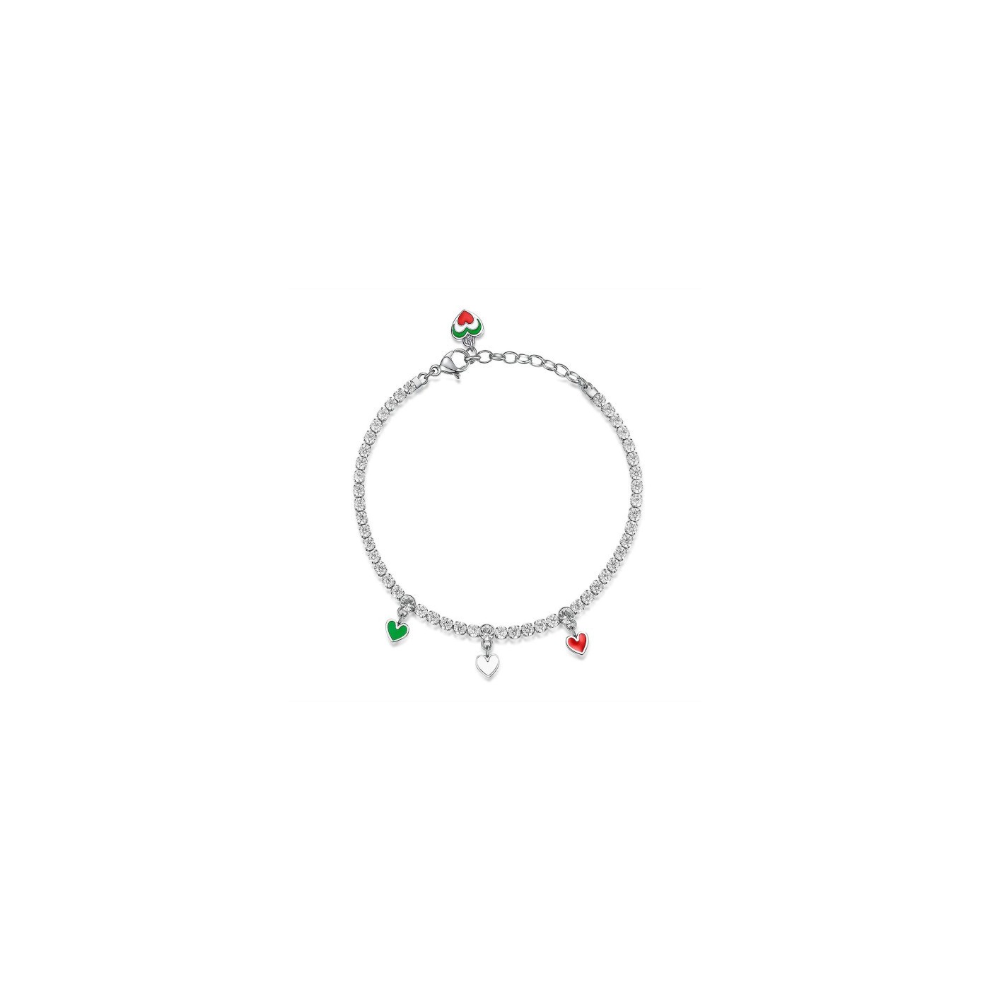 Bracciale donna Brosway della collezione Desideri. Bracciale in acciaio 304L con zirconi bianchi e pendenti a forma di cuore smaltati verde,bianco e rosso.
