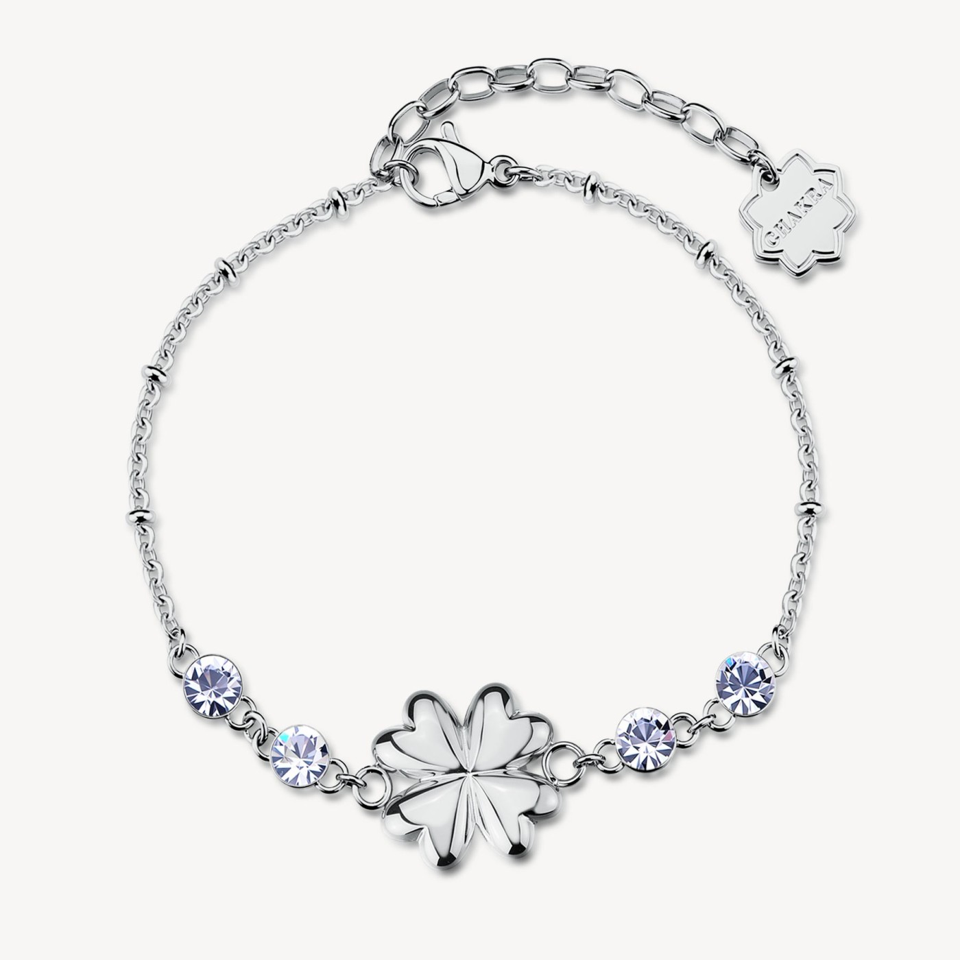 Bracciale in acciaio 316L con quadrifoglio centrale e cristalli.