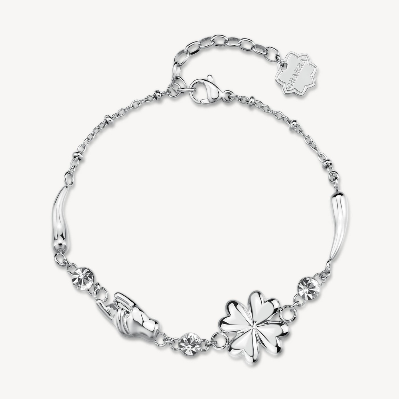 Bracciale in acciaio 316L con cornetto, corna, quadrifoglio e cristalli.