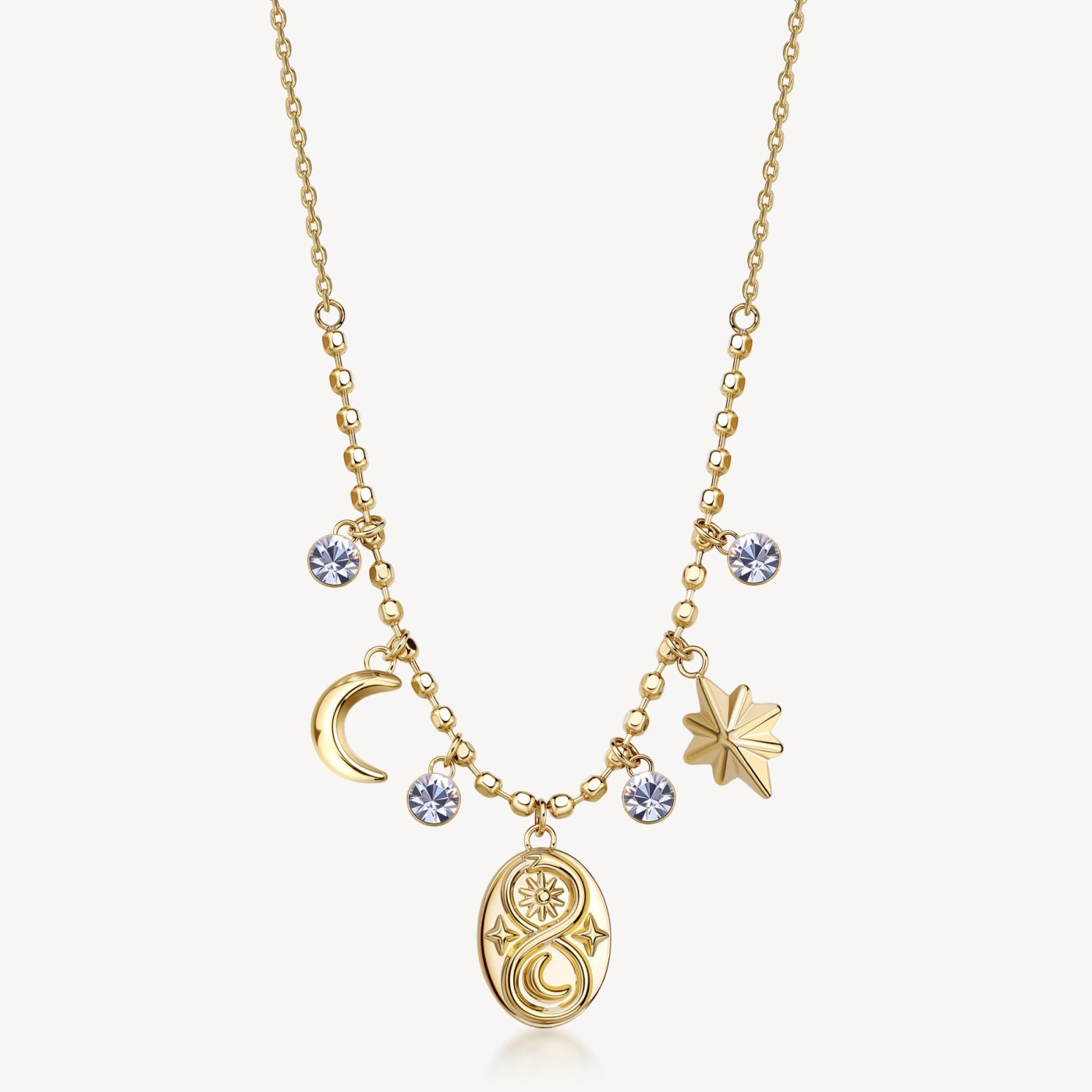 Collana in acciaio 316L e finitura pvd oro 14K, con pendenti a forma di serpente, rosa dei venti e luna con cristalli.