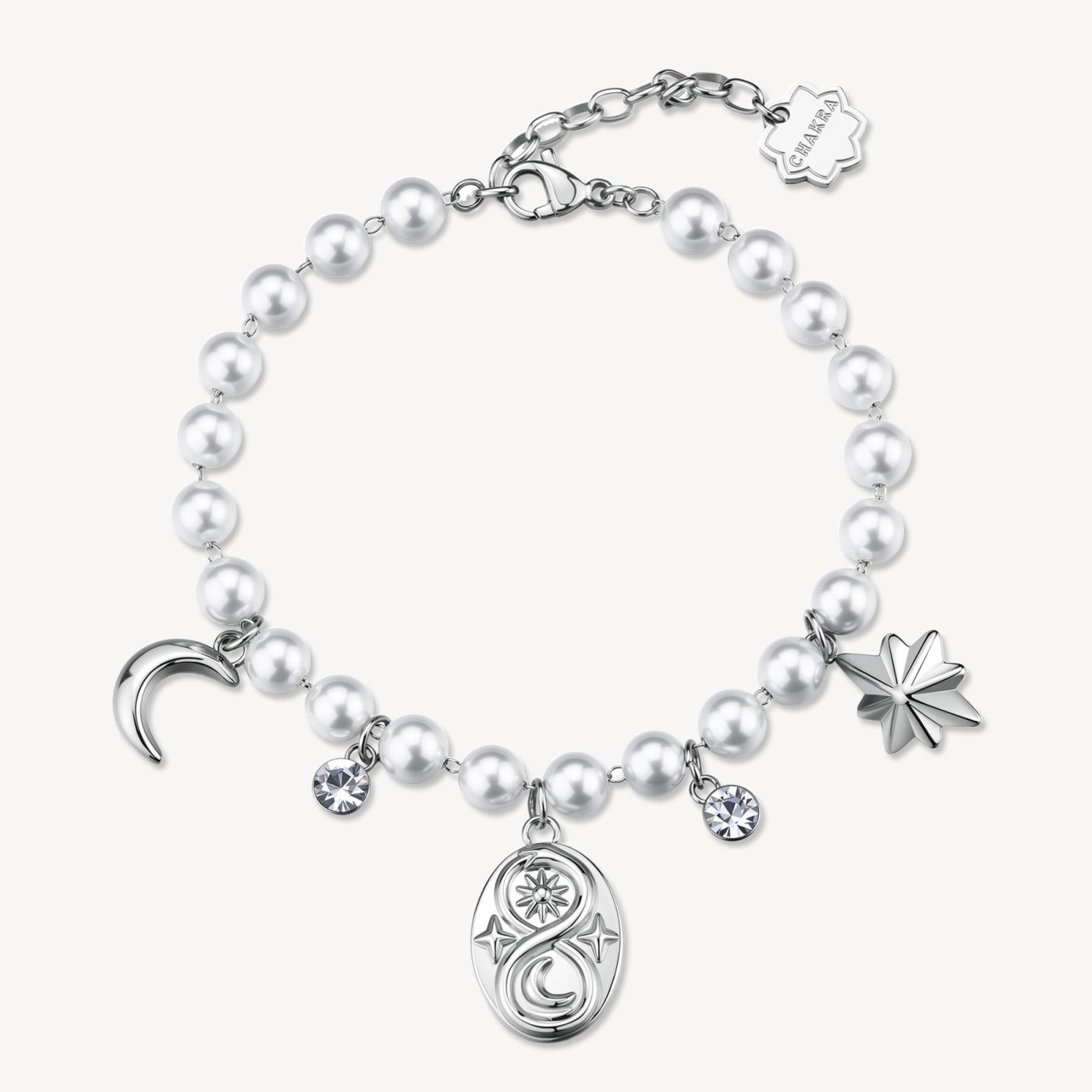 Bracciale in acciaio 316L con luna, serpente, rosa dei venti, cristalli e perle di conchiglia.