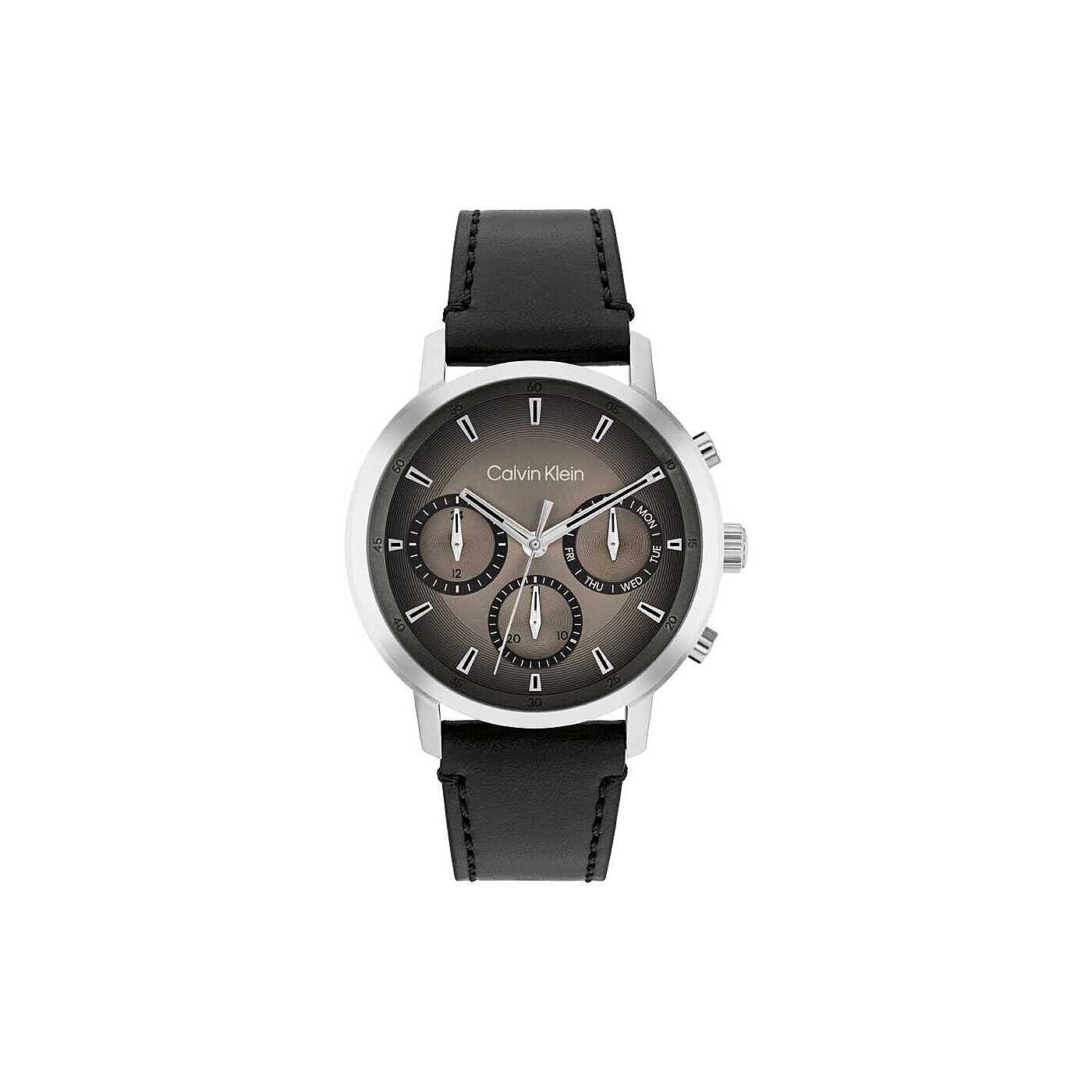 Orologio da uomo di Calvin Klein della collezione Gauge. Orologio con cassa in acciaio di colore silver , dimensione cassa di 41 mm, cinturino in pelle di colore nero, resistenza all'acqua di 3 atm e movimento multifunzione.
