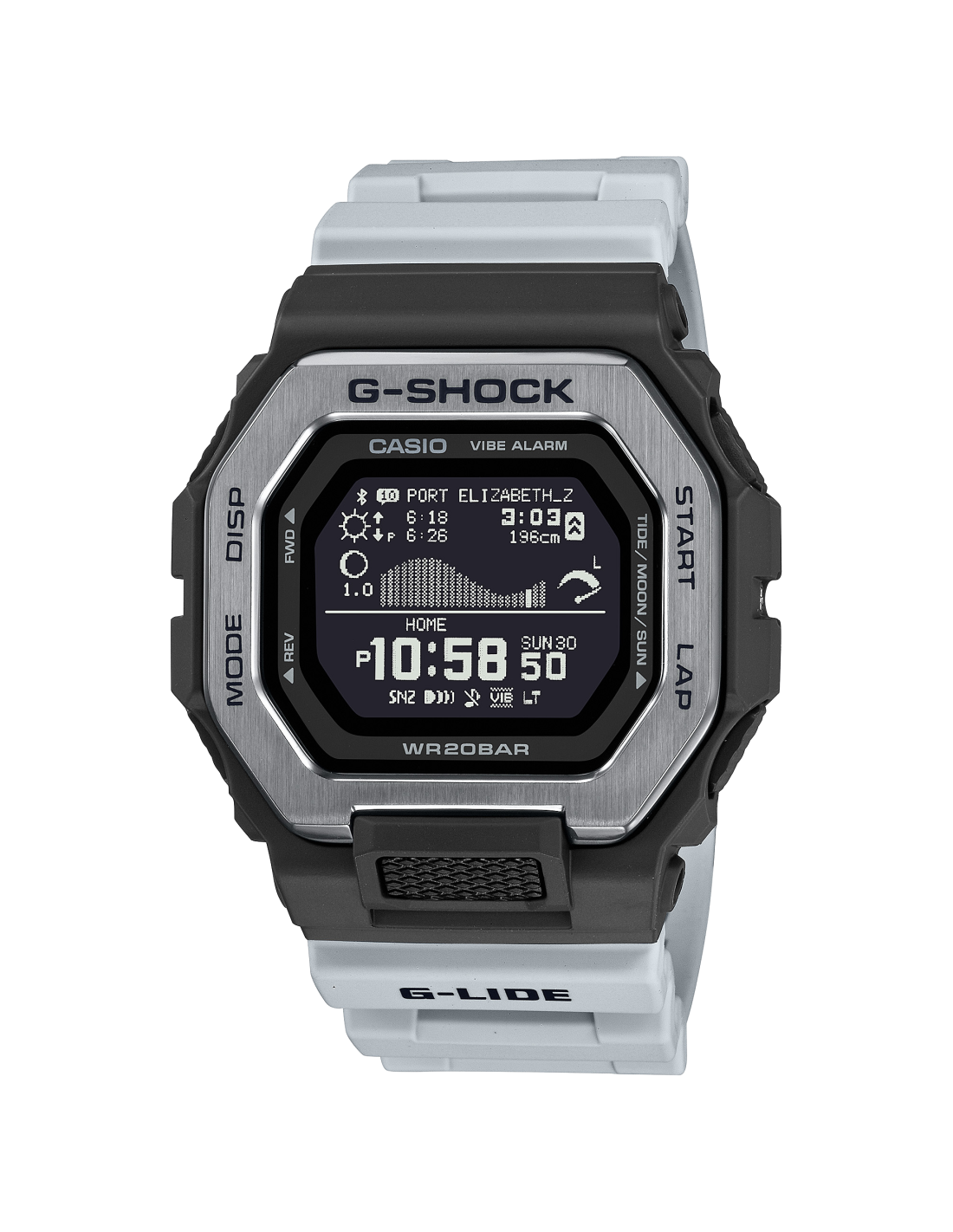 Gli orologi GBX-100 collegati allo smartphone fondono la colorata tavolozza da surf di oggi e la nostalgica tinta unita ispirata alle foto in bianco e nero del surf dei tempi passati. È sufficiente impostare l'app dedicata dello smartphone su uno dei 3.300 punti surf di tutto il mondo per controllare le maree e le condizioni della luce del giorno esattamente nel punto in cui ti trovi. L'ampio quadrante dell'orologio con display LCD Memory in pixel (MIP) ad alta risoluzione consente letture chiare di grafici delle maree, età della luna, livelli e orari di alte/basse maree e orari di alba/tramonto, tutto a colpo d'occhio.
